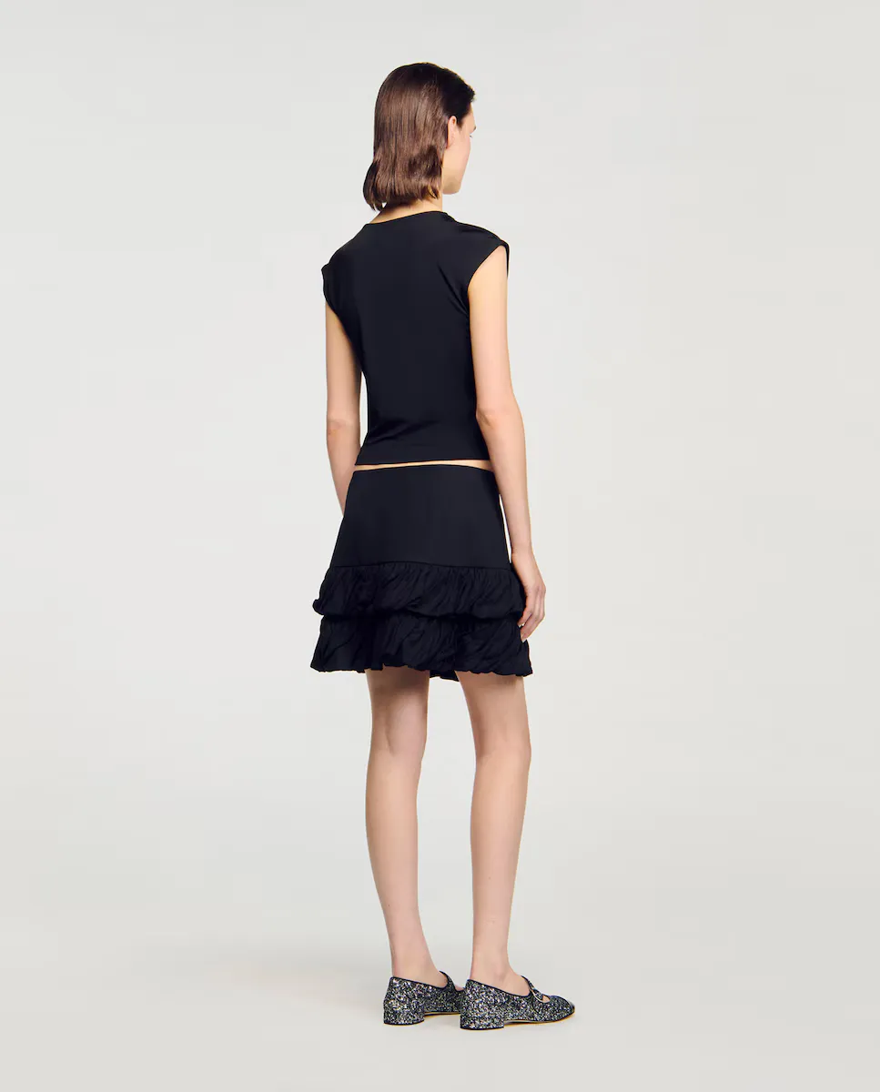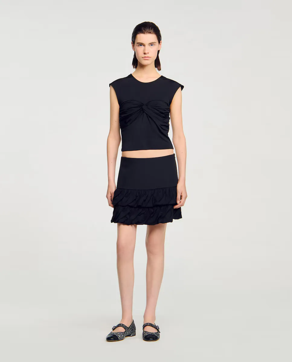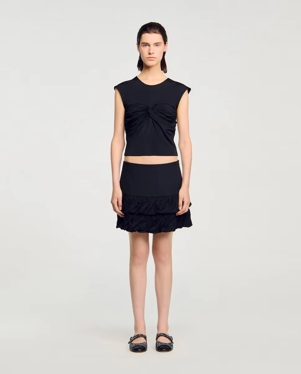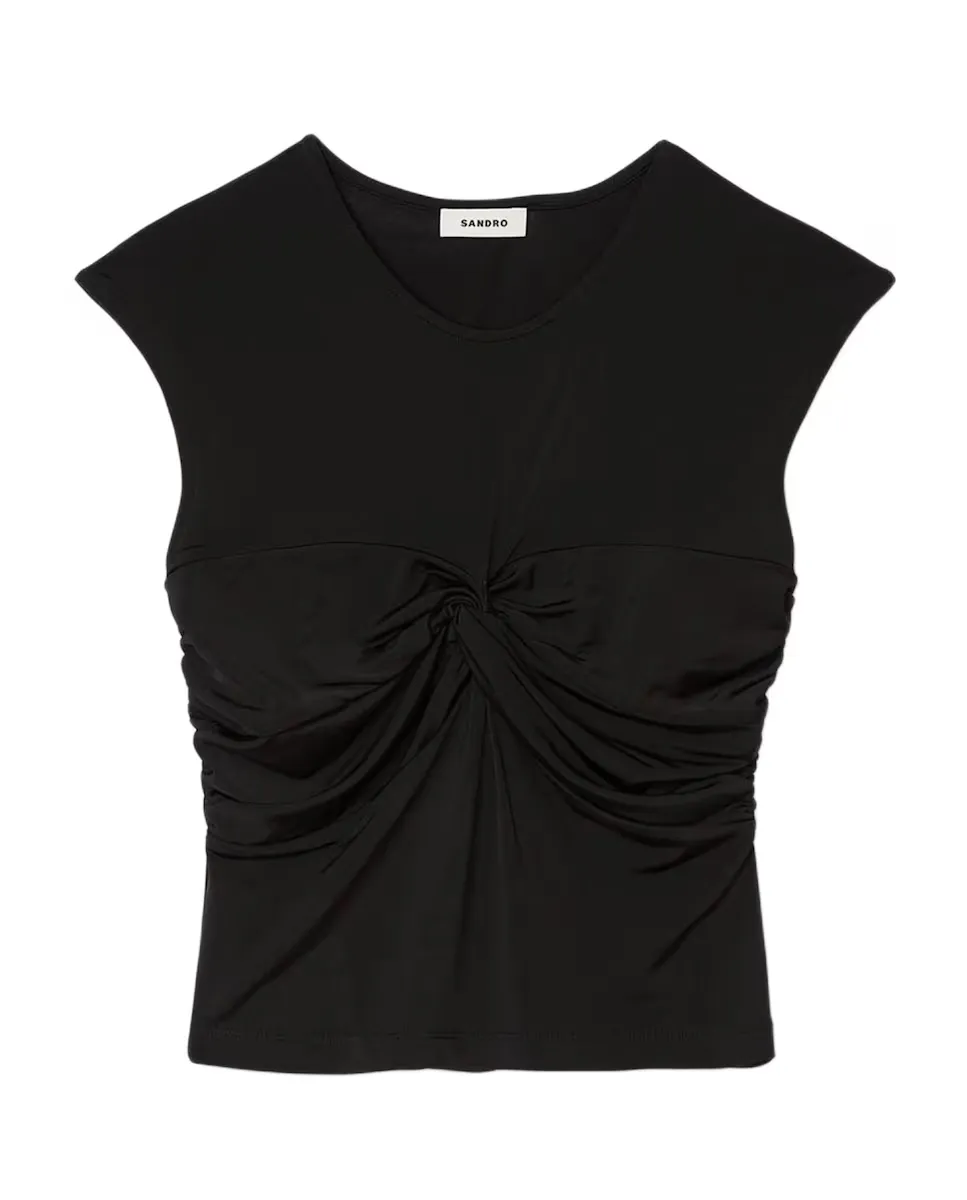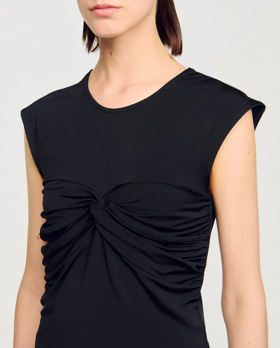 Топ без рукавов с драпировкой и скручиванием на груди, с круглым вырезом и тонкой вязкой. Футболка Sandro для женщин. Круглый вырез. Без рукавов. Драпировка и складки спереди.