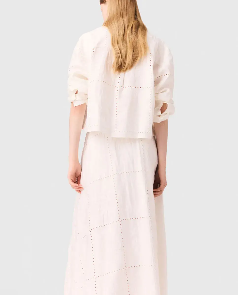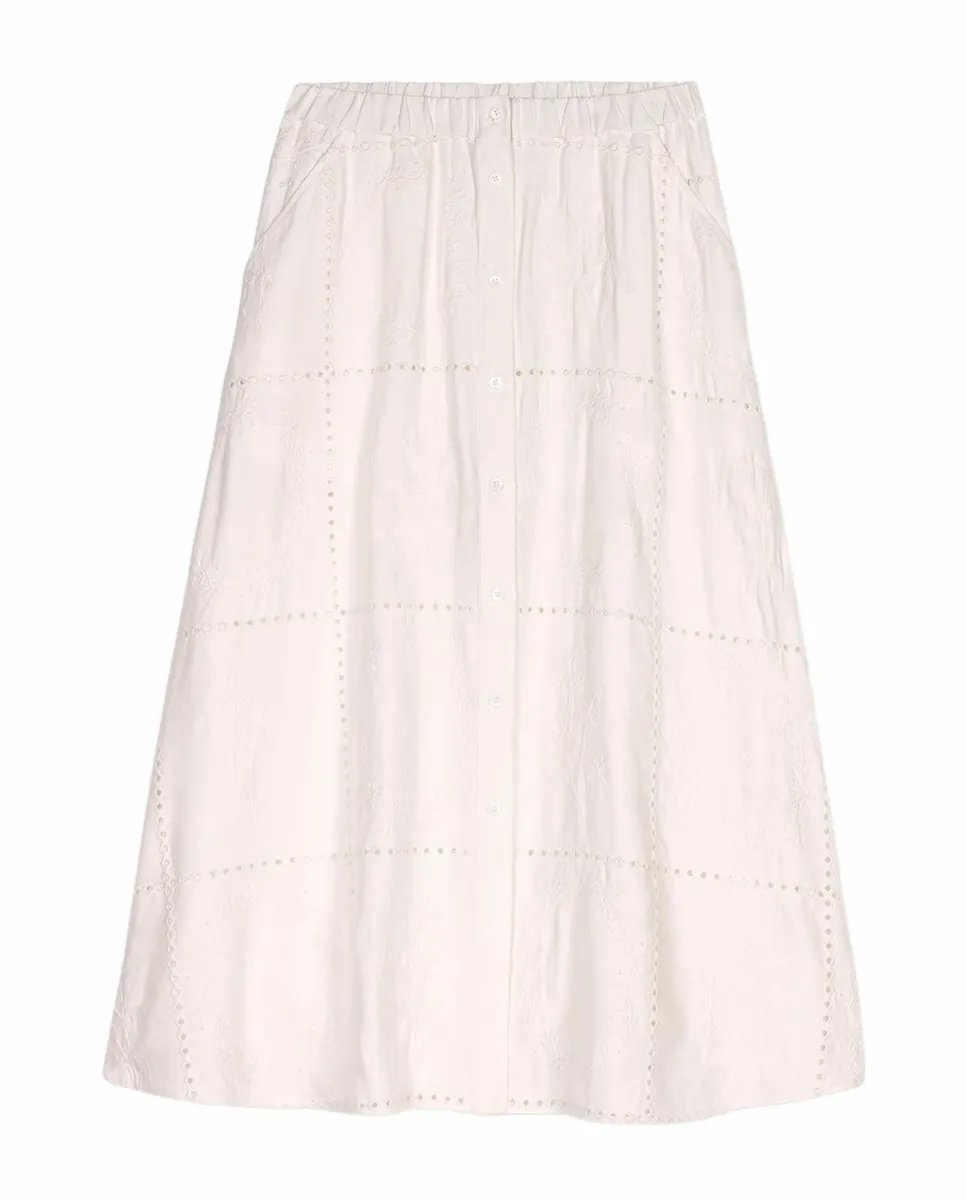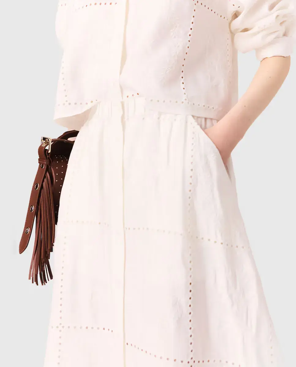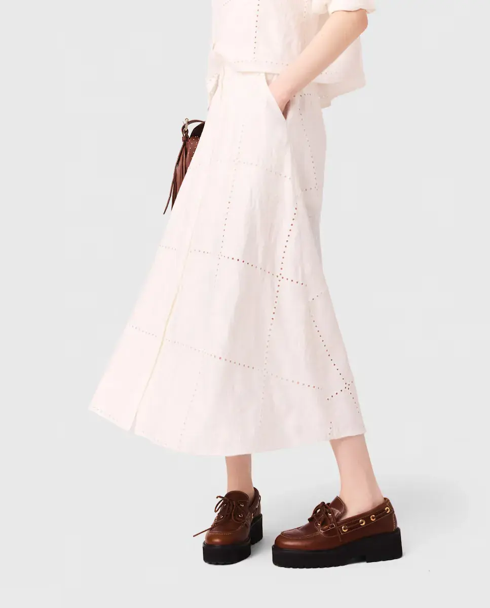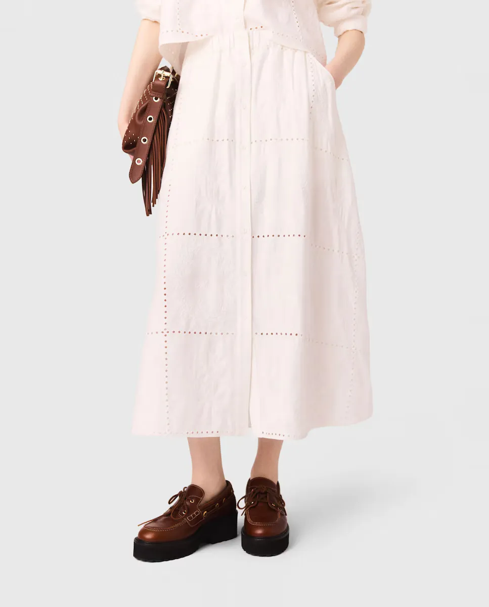 Длинная льняная юбка с вышивкой цветами. Эластичный пояс. Застежка на пуговицы спереди. Вдохновленная концом лета, эта коллекция вызывает образ женщины между Сен-Тропе и Касси. Между воспоминаниями детства и рынками Прованса, она сочетает простоту и элегантность с вечными, легкими и идеальными для перехода в осень нарядами. Эта длинная льняная юбка с цветочной вышивкой воплощает легкость сезона. Ее эластичный пояс гарантирует оптимальный комфорт, тогда как застежка на пуговицы спереди придает практичный и элегантный вид силуэту. Выбирайте координированную рубашку и добавьте характерные аксессуары, такие как кожаные туфли и сумка от бренда.