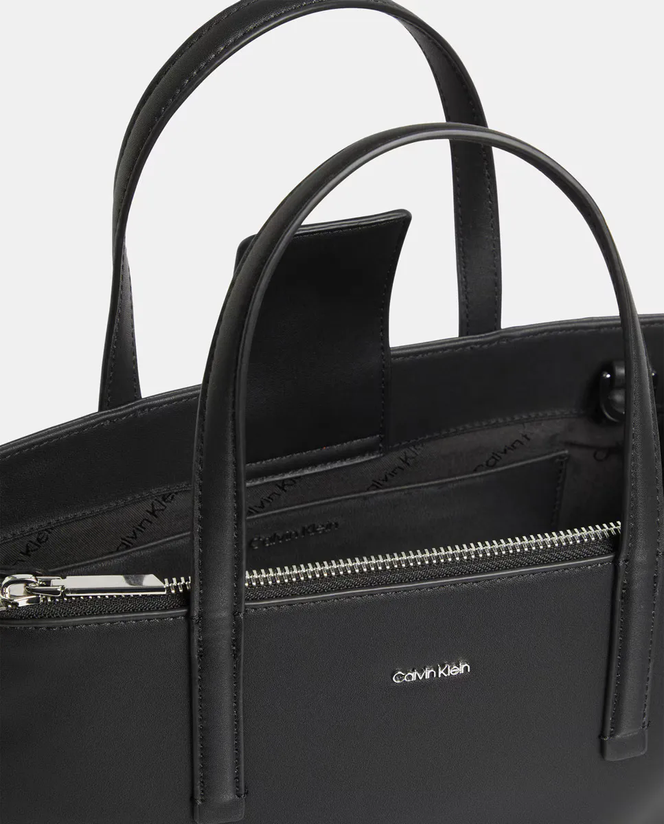 Сумка-тоут среднего размера от Calvin Klein, с двумя короткими ручками и длинной ручкой, магнитной застежкой и внутренним карманом на молнии с металлическим логотипом спереди.