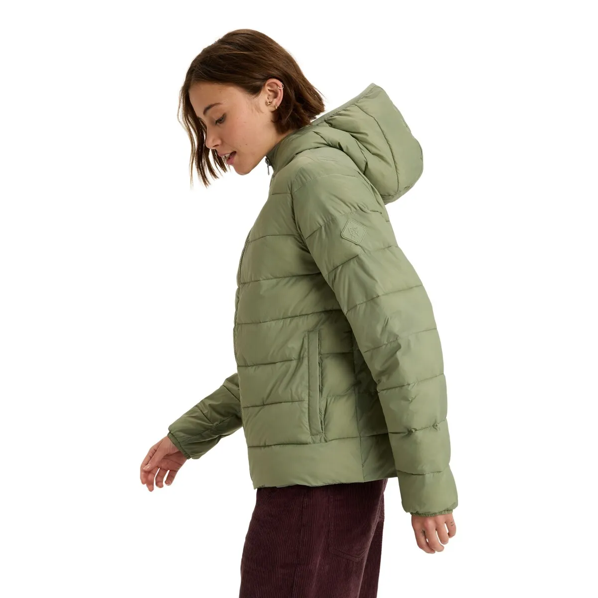 Легкая сжатая пуховка для женщин. Характеристики включают: Ткань: переработанный нейлон, крой: обычный крой, Капюшон: полностью подлестный и пуховый капюшон, Подкладка: полная и пуховая подкладка, Карманы: боковые карманы, Застежка: фронтальная застежка на молнии, Силиконовый пакет Roxy и Можно хранить в внутреннем кармане.