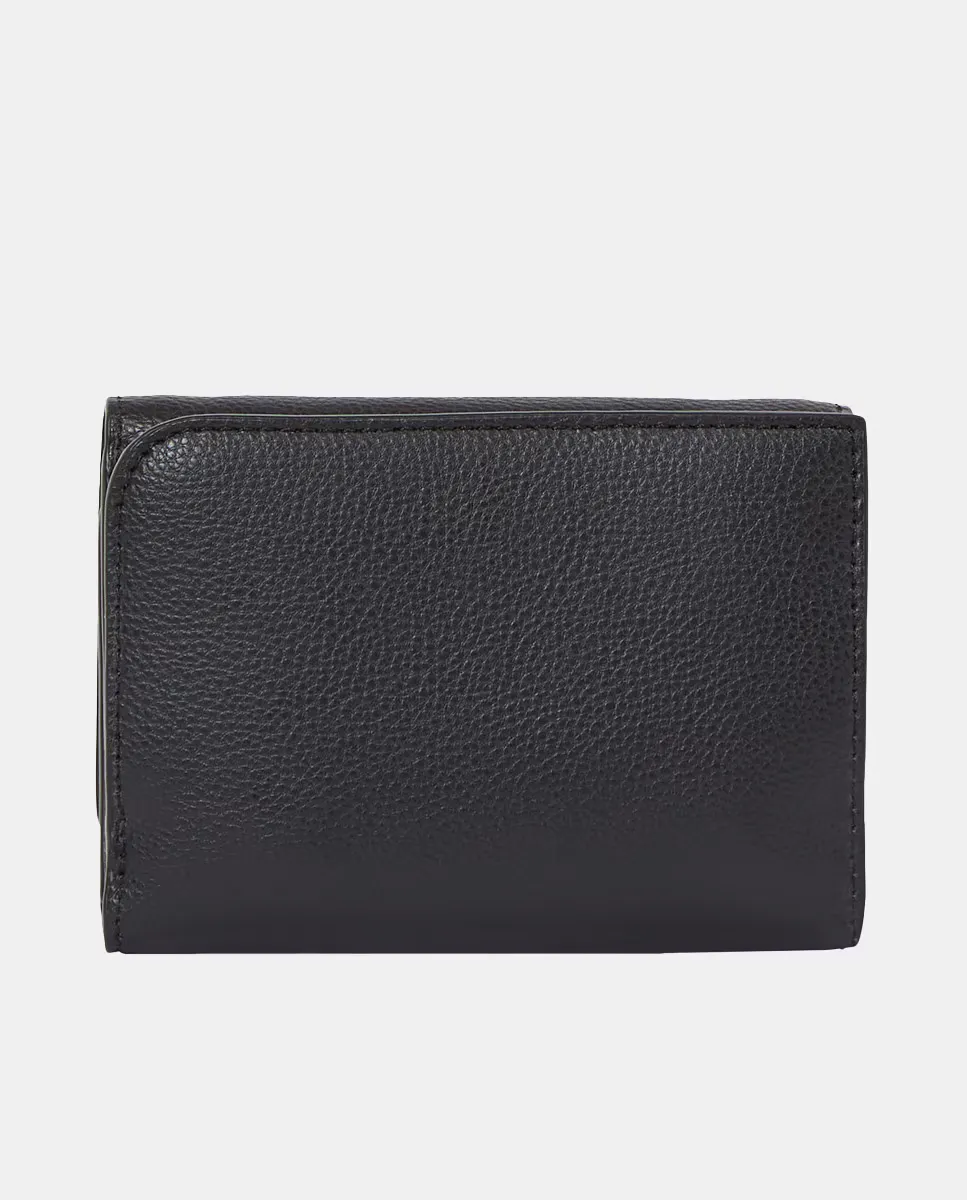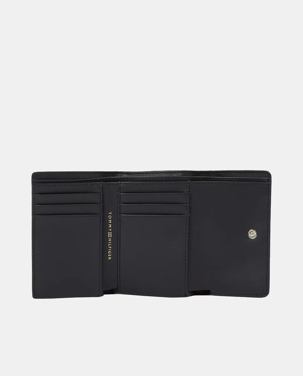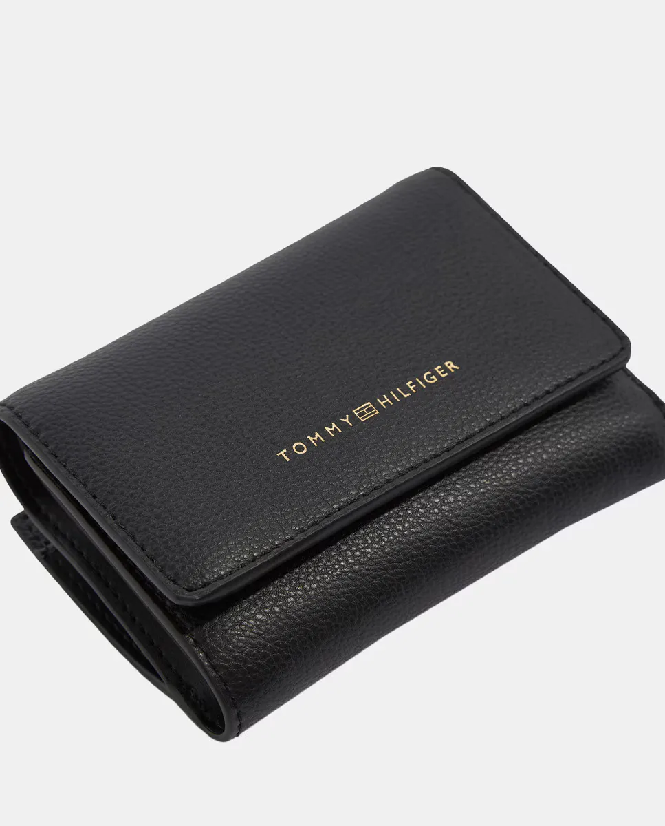 Средняя женская сумка, изготовленная из экокожи черного цвета. Дизайн с держателем для карточек, кошельком и закрытием на клапан. Детааль с золотым логотипом Tommy Hilfiger на фронтальной стороне.