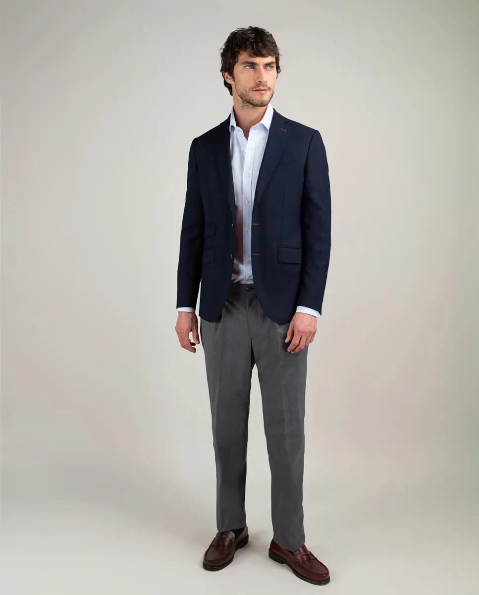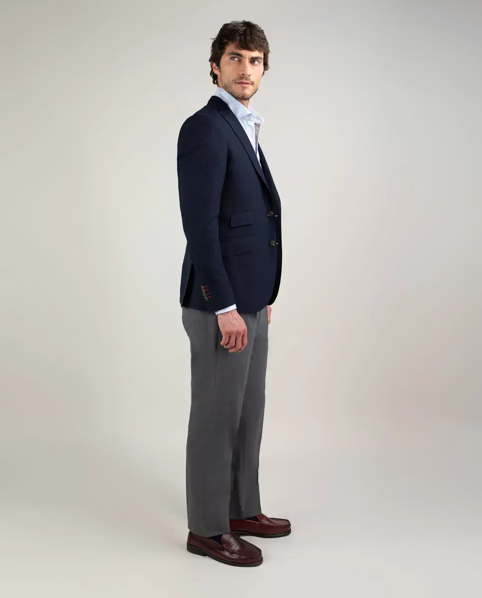 Американская координированная структура, стираемая в машине. Составлена до 60% из шерсти. Корректный силуэт, воротник с вырезом и застежка на пуговицы. Накладные карманы на бедрах, один накладной карман на уровне груди. Манжеты на 4 пуговицах из рога. Два разреза сзади. Деталь из полосатой ткани на внутренней стороне воротника. Поставляется с сетчатым мешком и инструкцией по стирке.