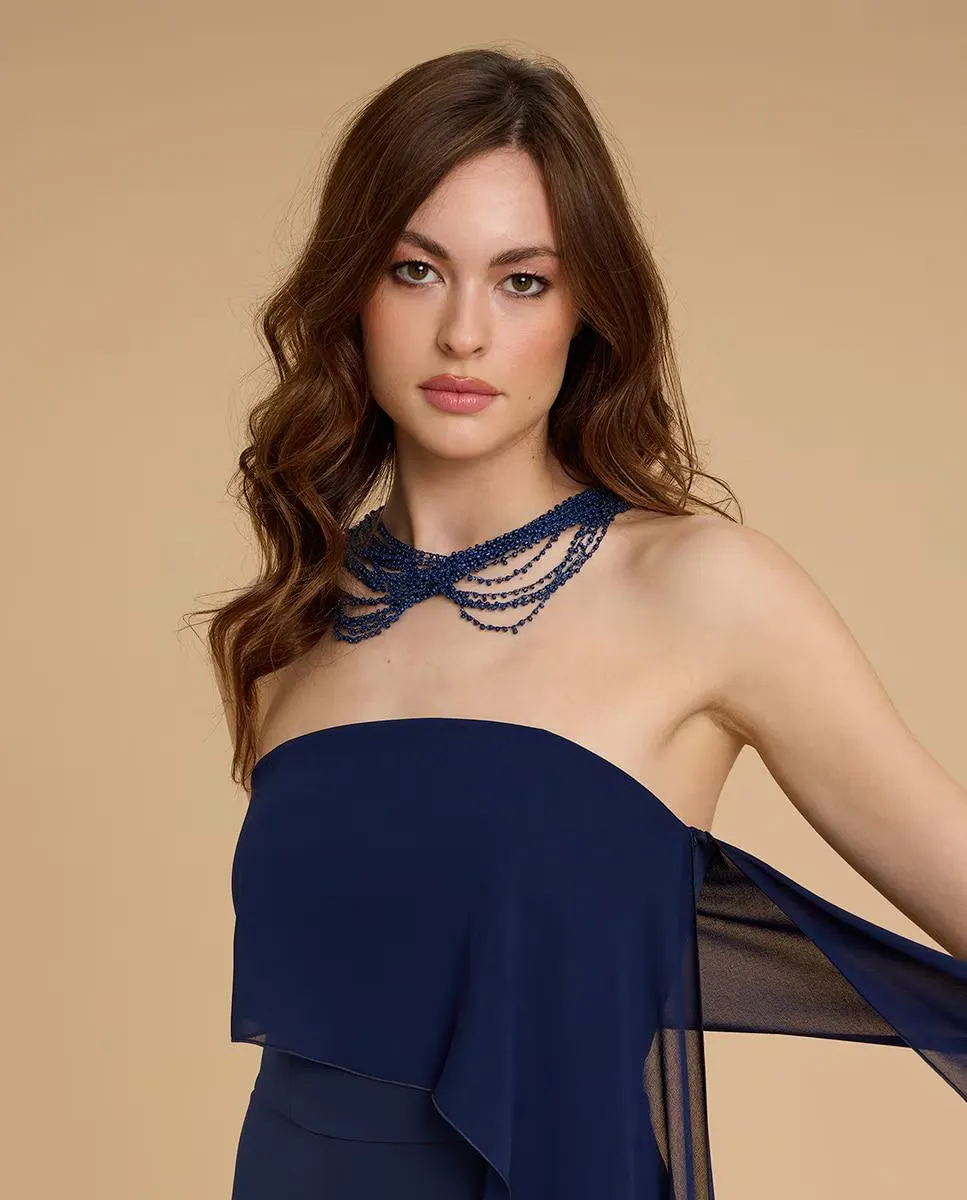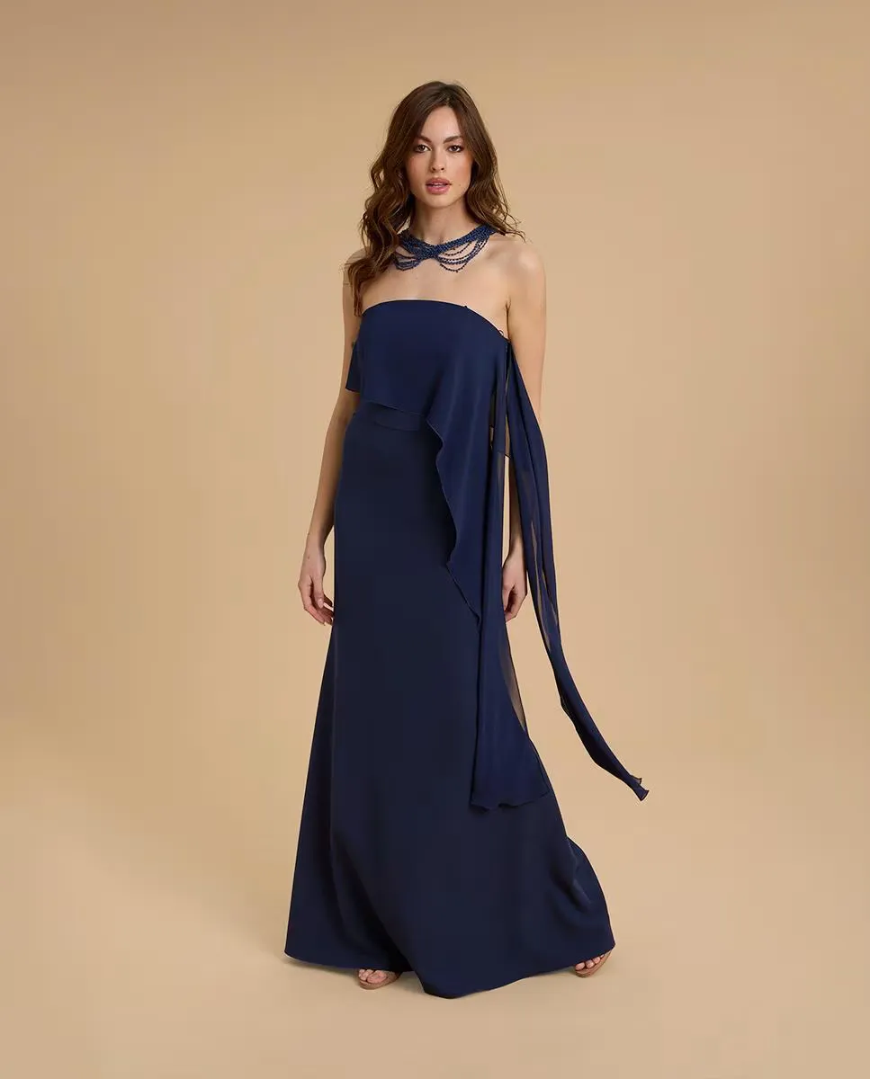 Длинное вечернее платье из крепа. Вырез «слово чести» с асимметричным шёлковым платком. Аксессуары не включены.