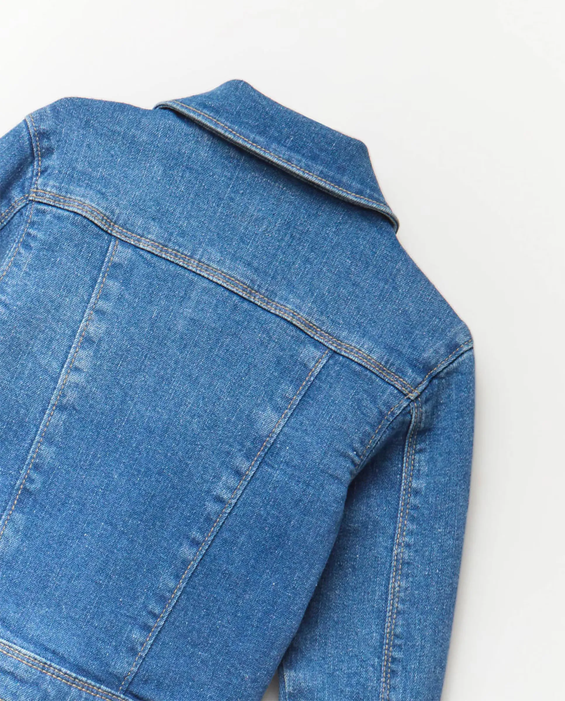 Базовая джинсовая куртка с воротником и передними карманами с клапанами. Передняя застежка на пуговицах.