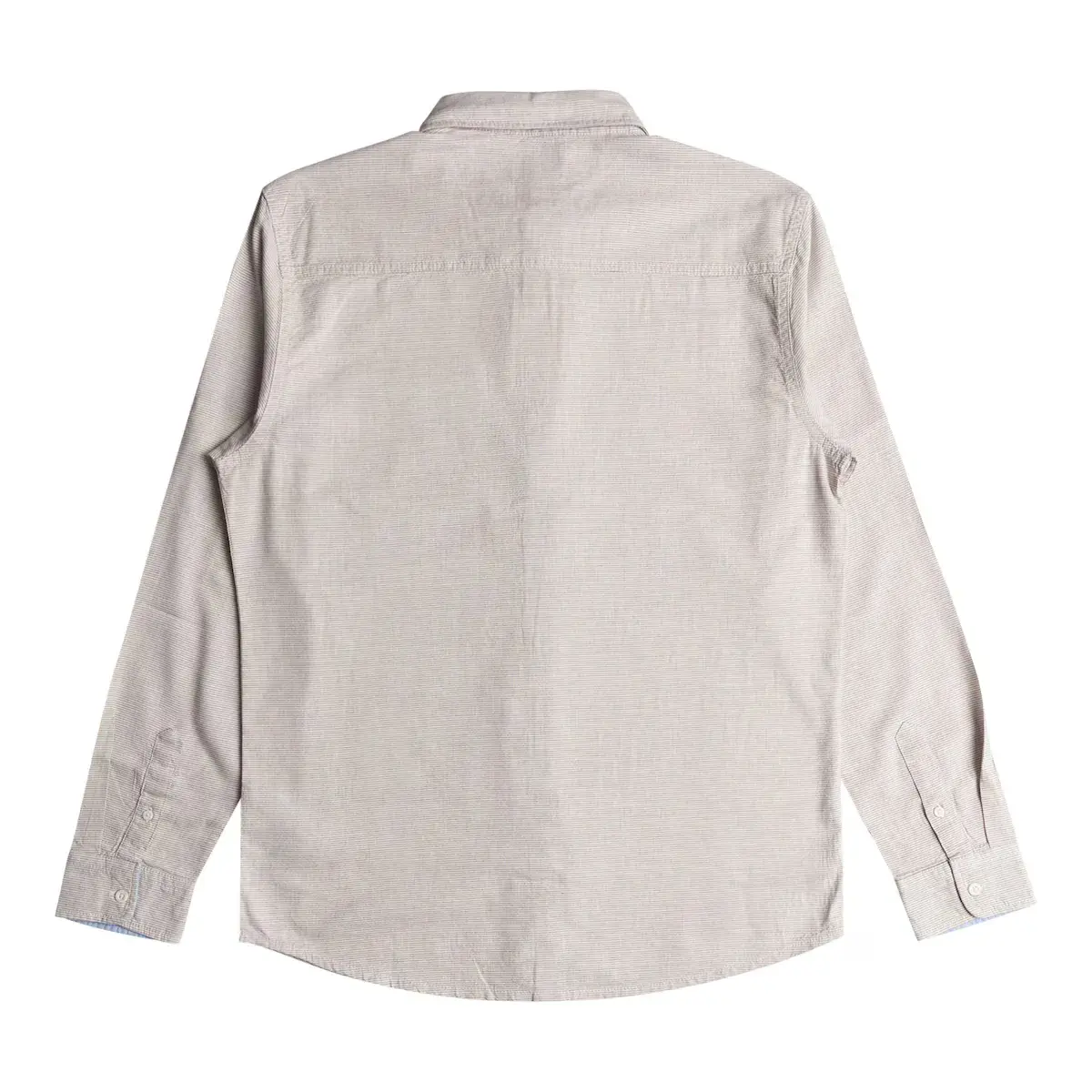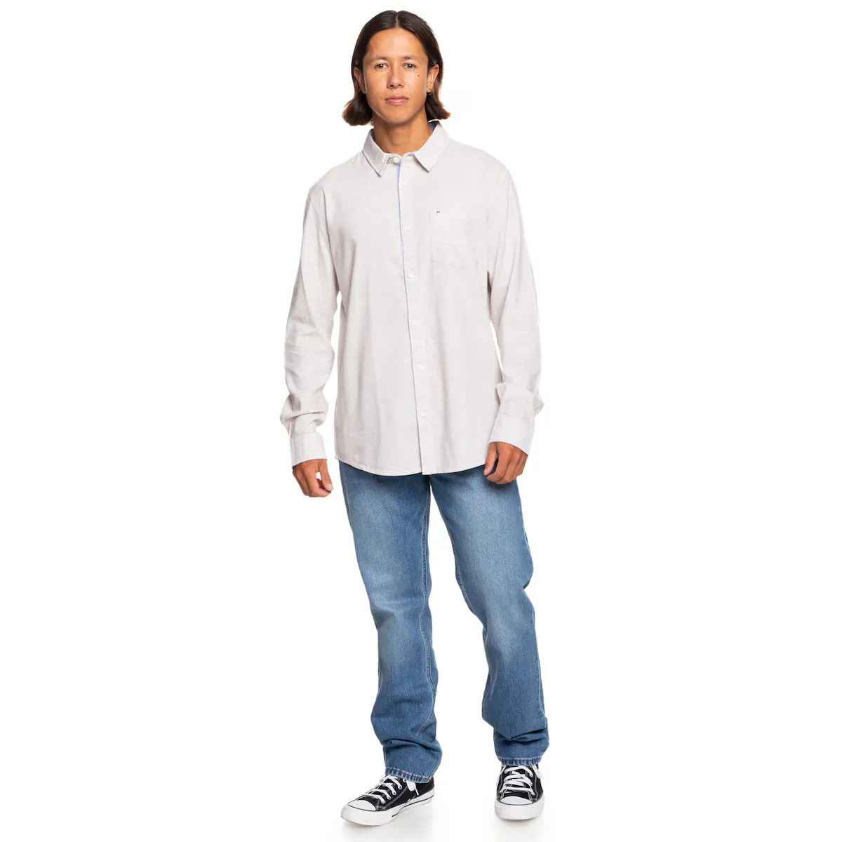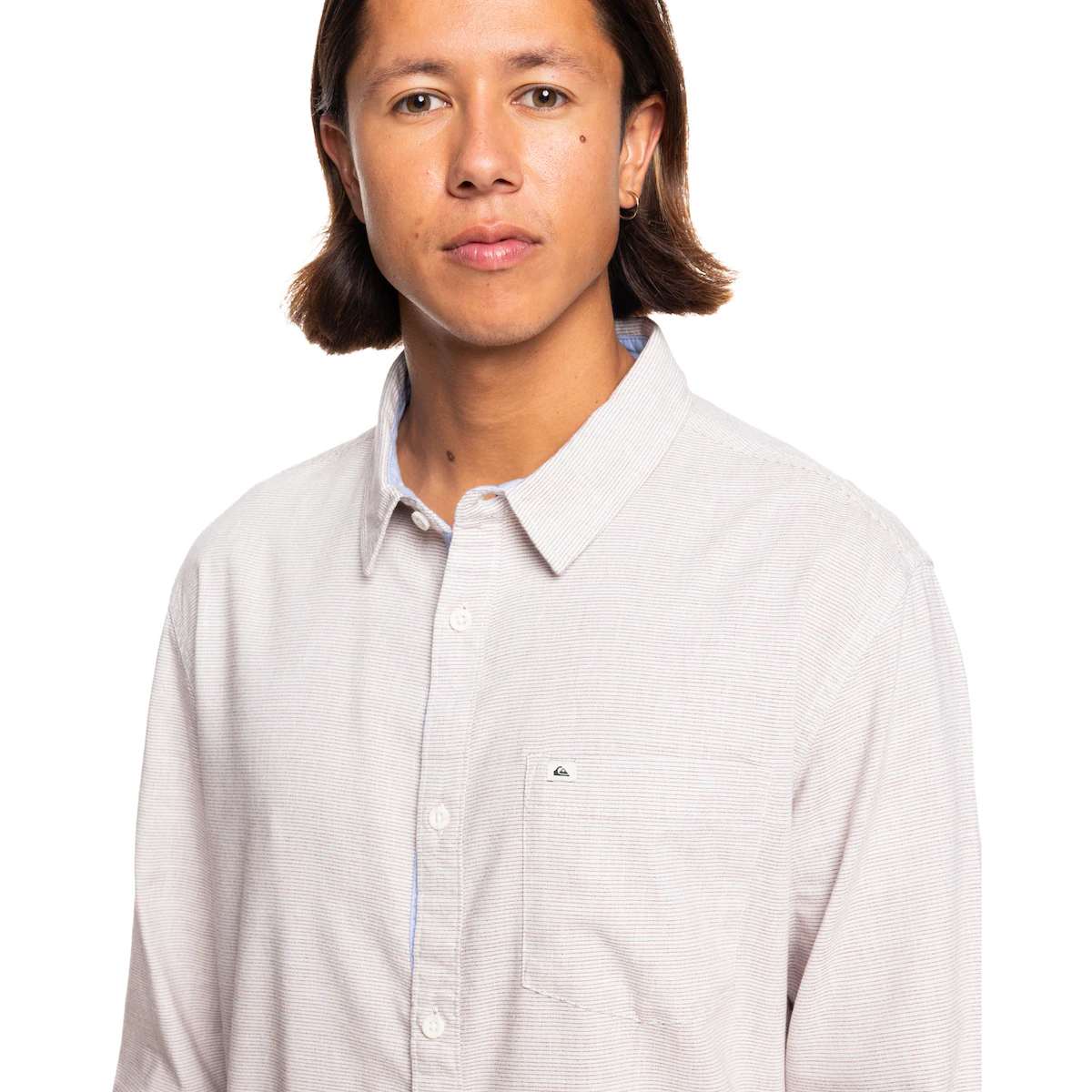 Рубашка с длинным рукавом для мужчин. Особенности включают: смесь камбрай, вискозы и хлопка, обычный крой, рукава: длинные, карман на груди, застежка: классическая застежка на пуговицу, ткань с немного трёпаными текстурами и переработанная бирка Quiksilver на кармане.