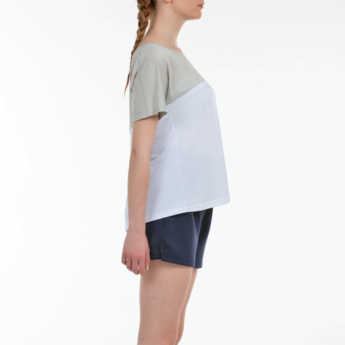 Легкая футболка из полиэстровой ткани, с сочетанием однотонного и полосатого текстиля, что обогащает изделие. Широкий силуэт с рукавами реглан и перекрещенной спиной.