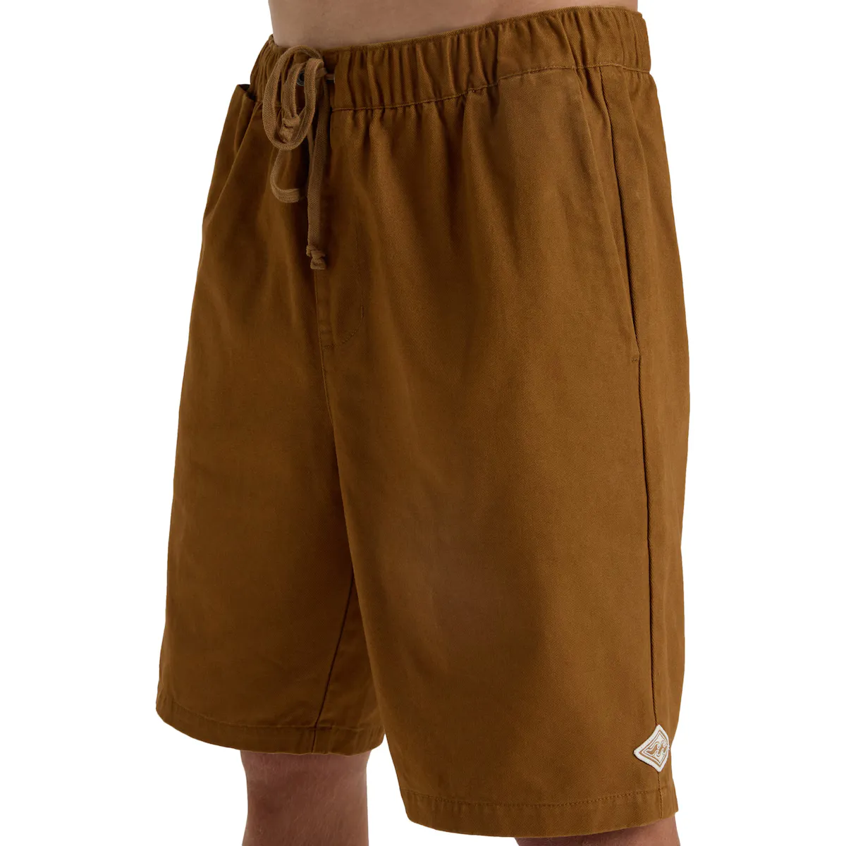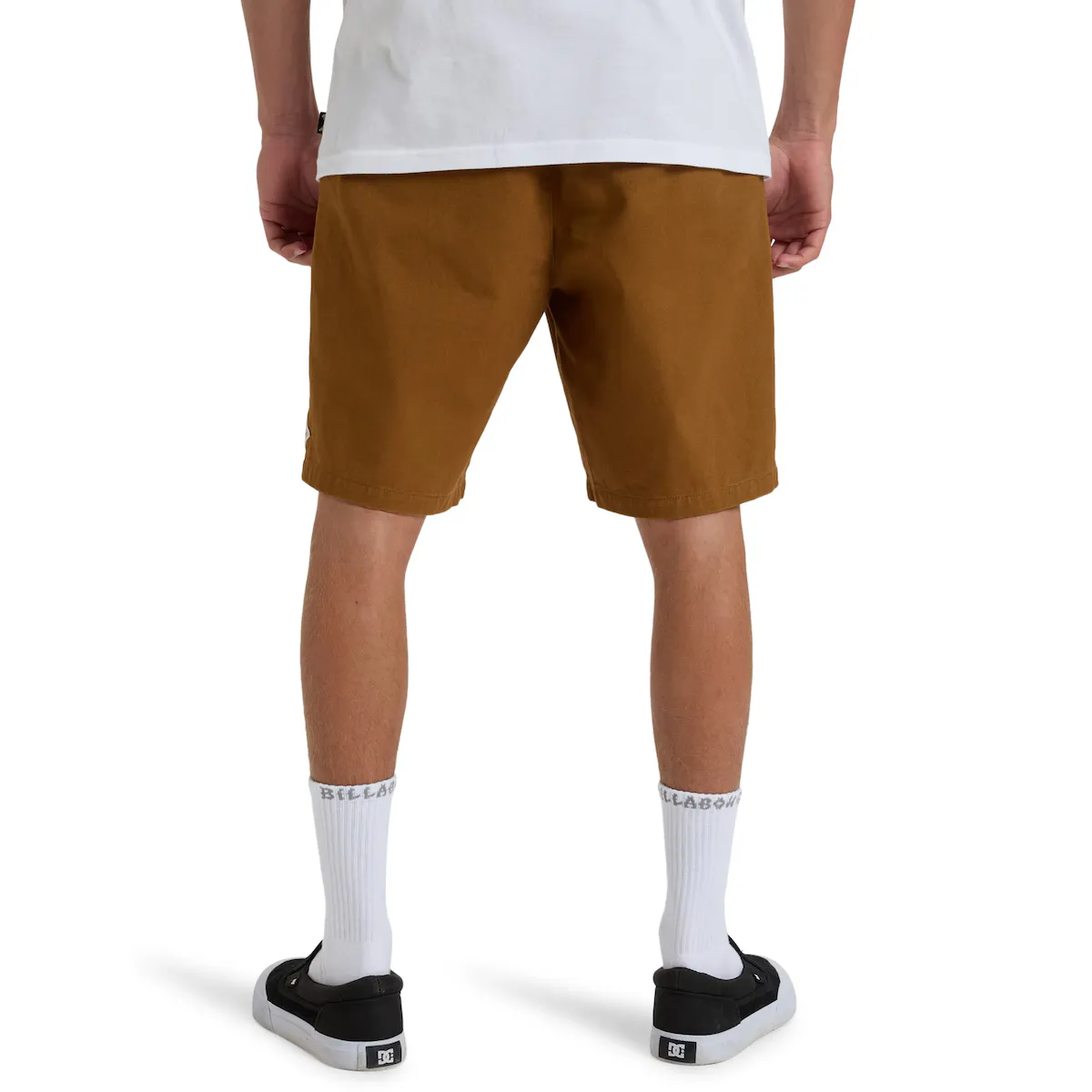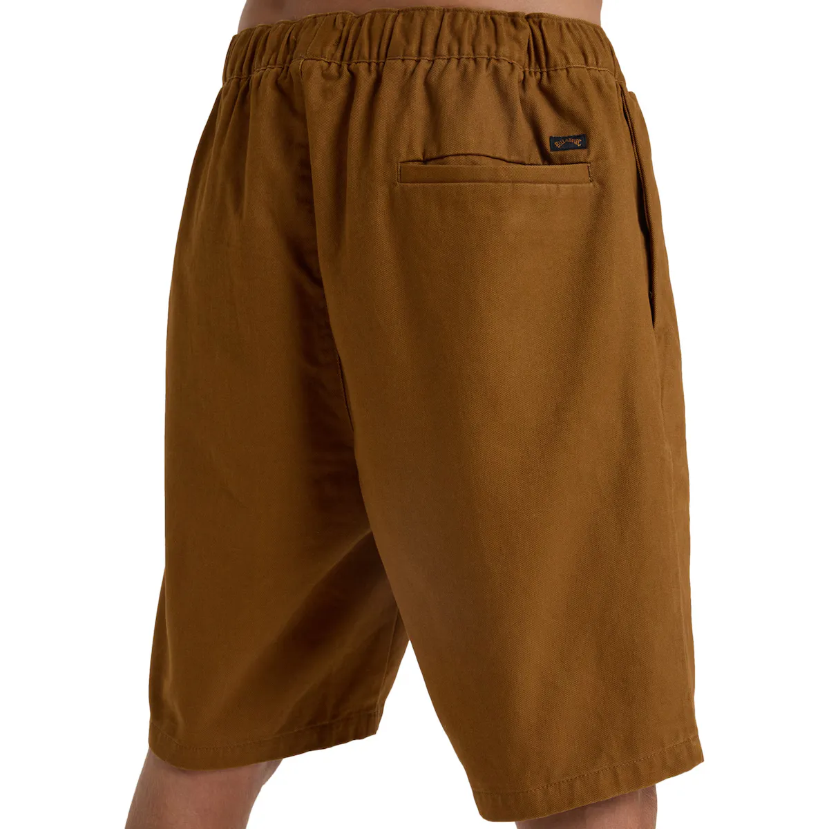 Бермуды с эластичным поясом для мужчин. Характеристики включают: Ткань: ткань саржа из хлопка, Крой: свободный покрой, Пояс: шорты для улицы с эластичным поясом, Застежка: регулируемая шнуровка, Длина: 50,8 см - короткие, Другие детали: карманы для рук, задние карманы, Бренд: Патч Billabong в форме ромба на левой ноге.