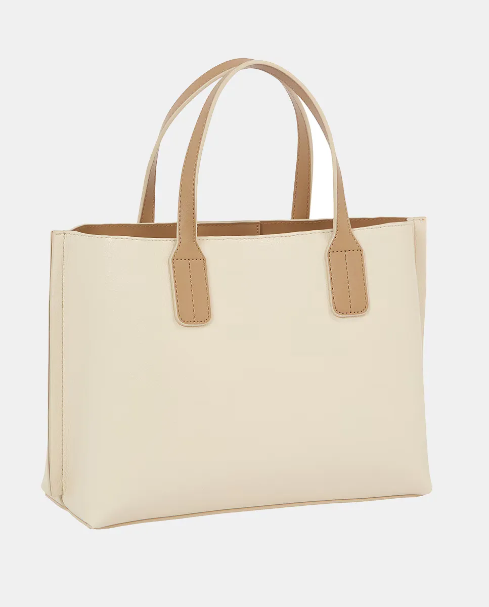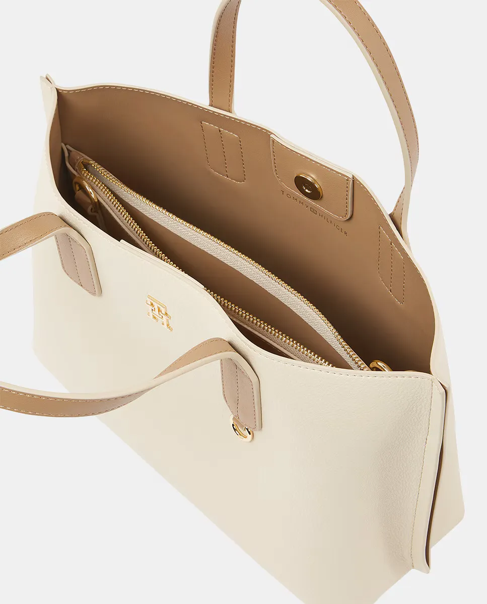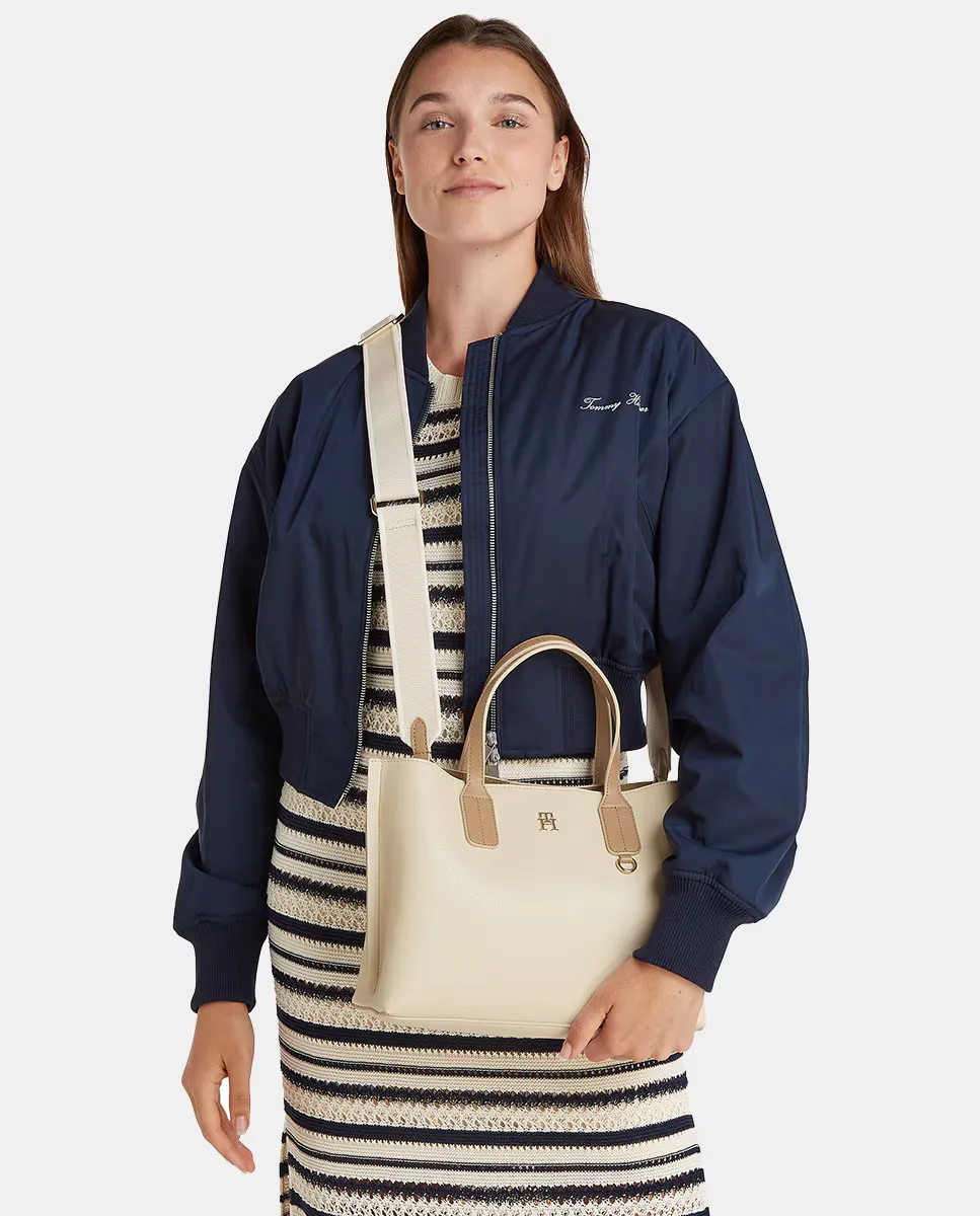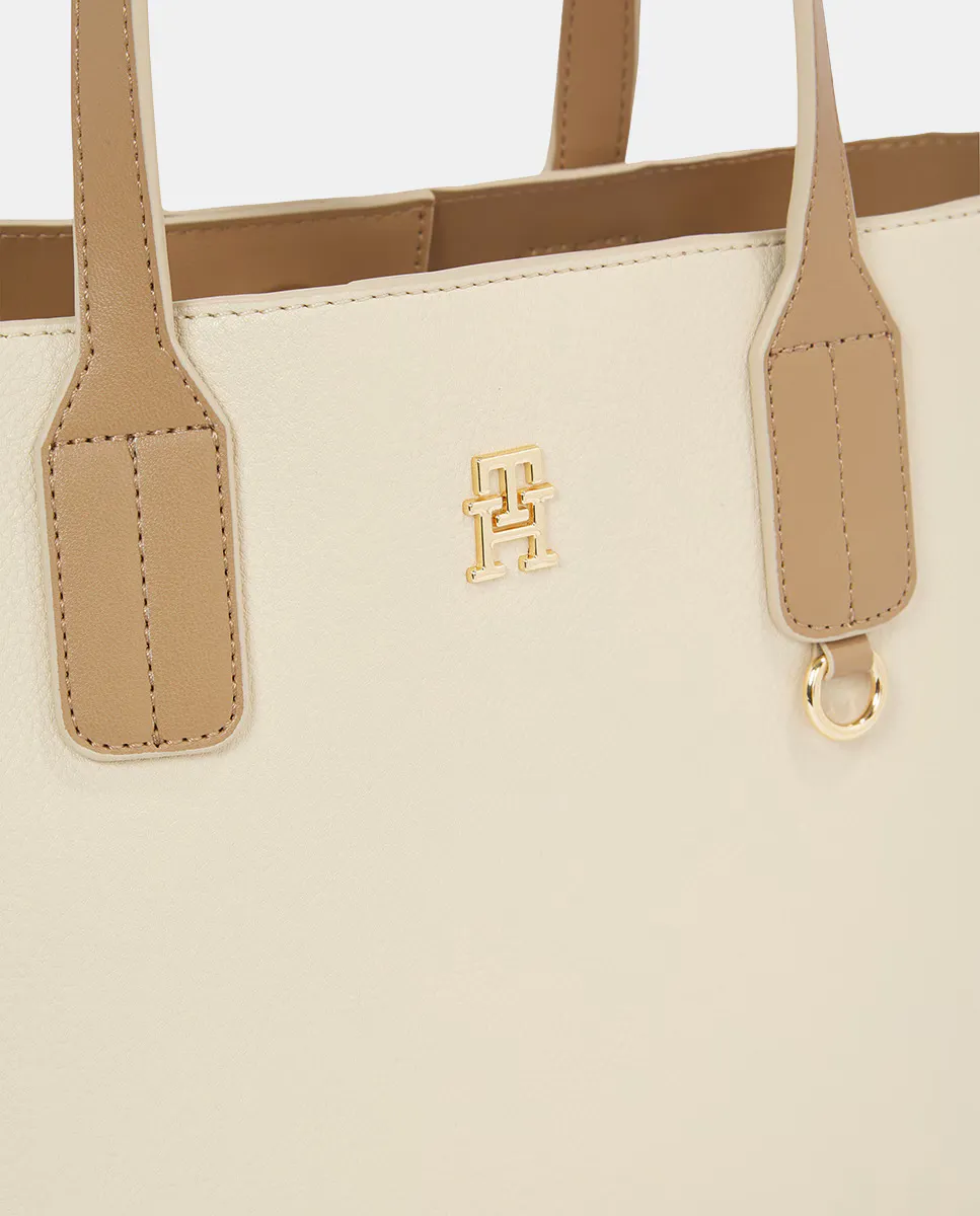 Мини-тоут для женщин из экокожи бежевого цвета с контрастными коричневыми ручками. Дизайн с регулируемым ремешком и застежкой на молнии. Деталь с металлическим логотипом Tommy Hilfiger на передней части.