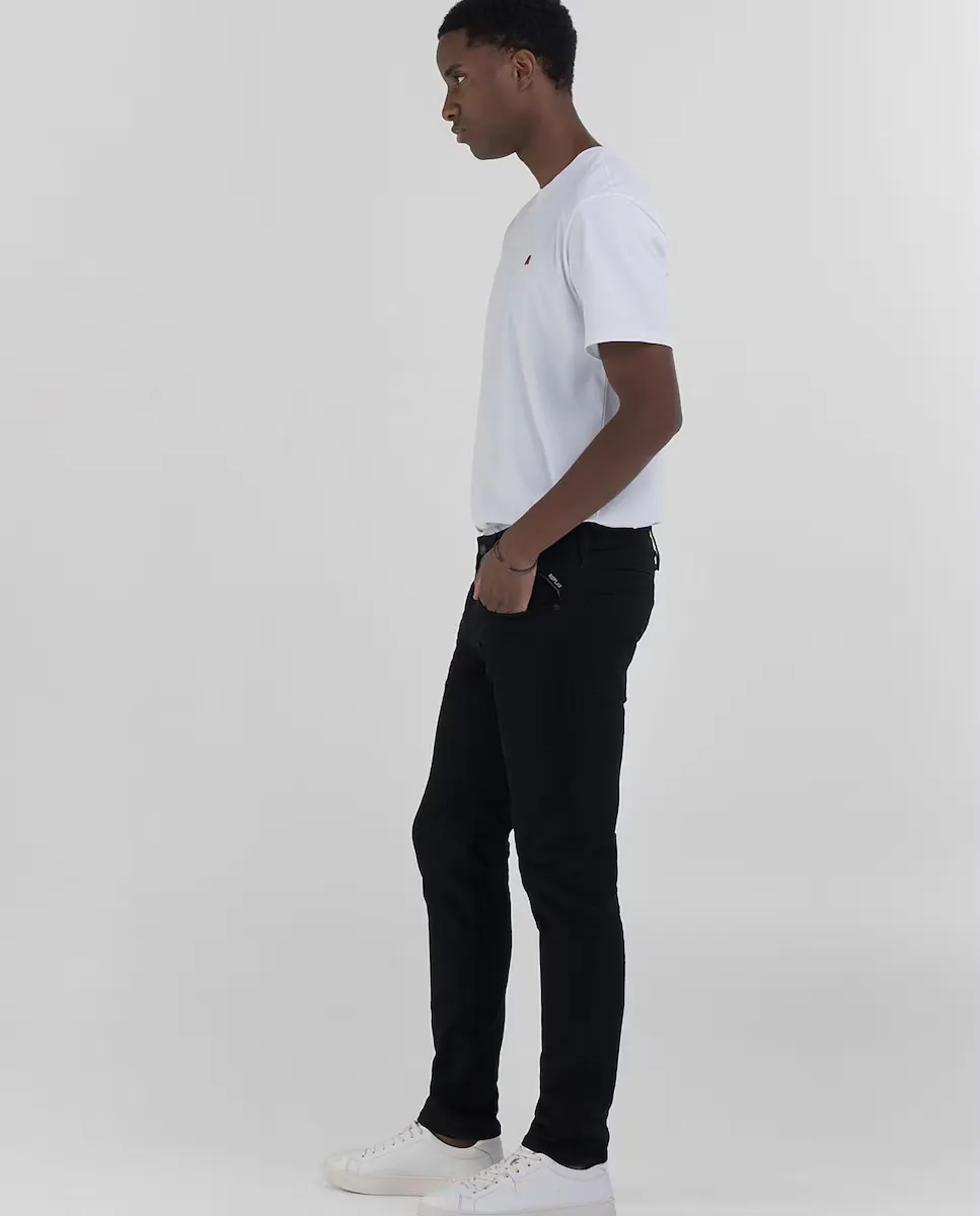 Джинсы с облегающим силуэтом и обычной талией, с широкими штанинами, которые сужаются к низу для удобной посадки. Изделие с пятью карманами изготовлено из черного денима с эластичным эффектом весом 9,5 унций с ферментной обработкой и темным оттенком стирки. Складки с эффектом 3D придают дополнительный характер этим джинсам современного стиля для мужчин. Знаковая отстрочка в виде гавайского крыла характеризует пятый карман и задние карманы, один из которых отделан вышивкой R. Застежка на пуговицу и молнию.