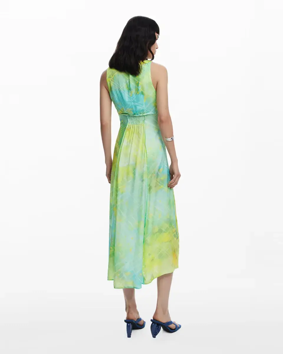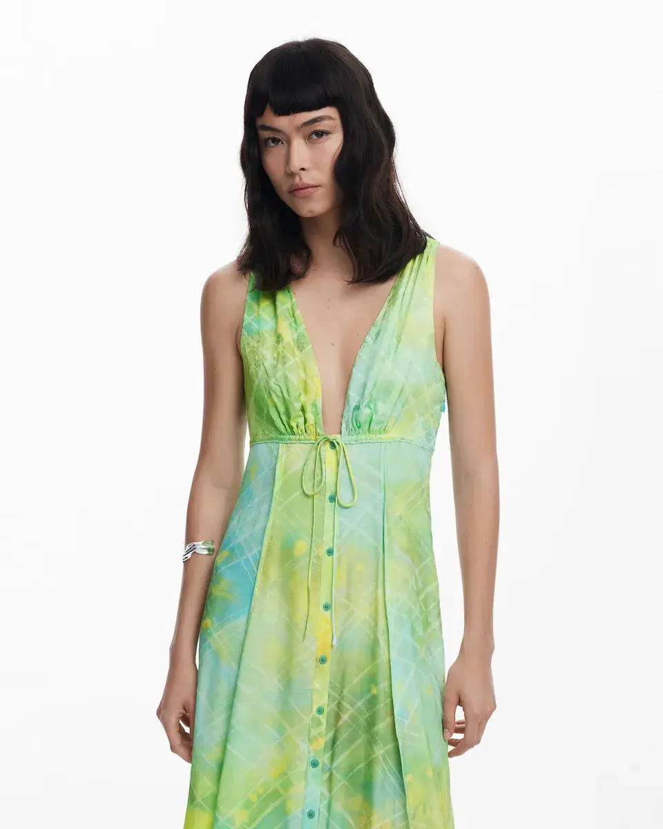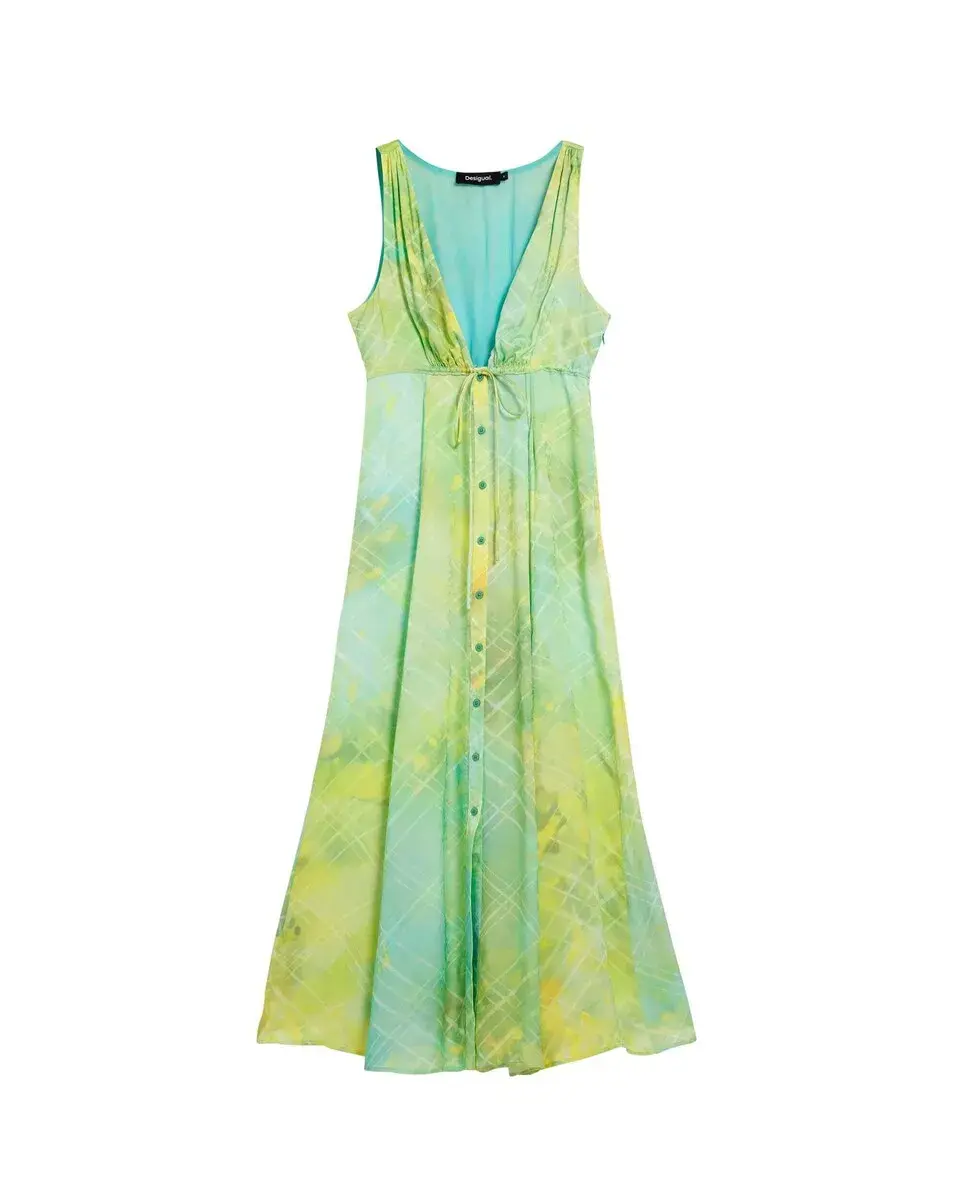 Безрукавное платье с V-образным вырезом, с пуговицами спереди, с завязкой на груди и с собранием сзади. Цвет: многоцветный. Крой: обычный. Без рукавов. Длина: длинное. Застежка: пуговицы спереди. Собрание сзади.