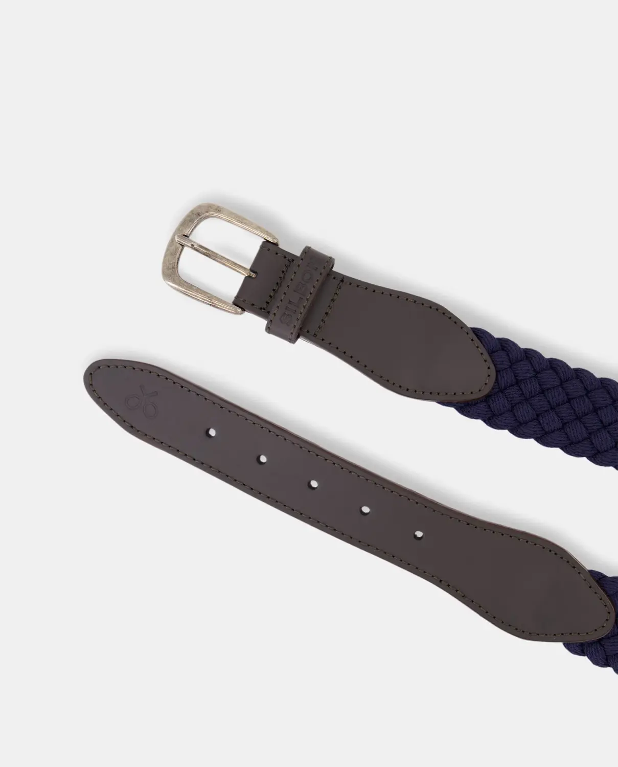 Плетеный ремень темно-синего цвета с кожаными концами. Обладает пряжкой цвета состаренного серебра, персонализацией на пряжке и тиснеными ракетками на конце. Изготовлено в Испании.
