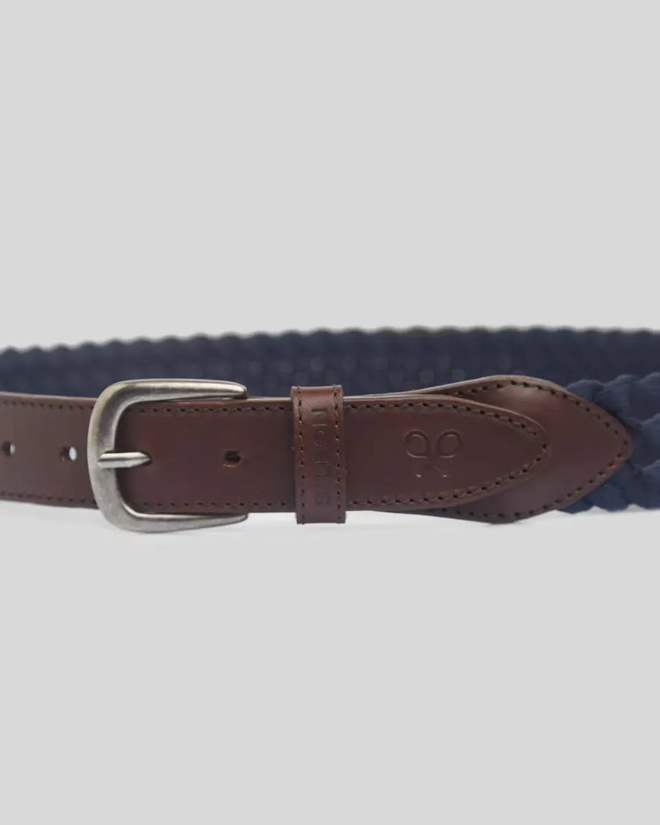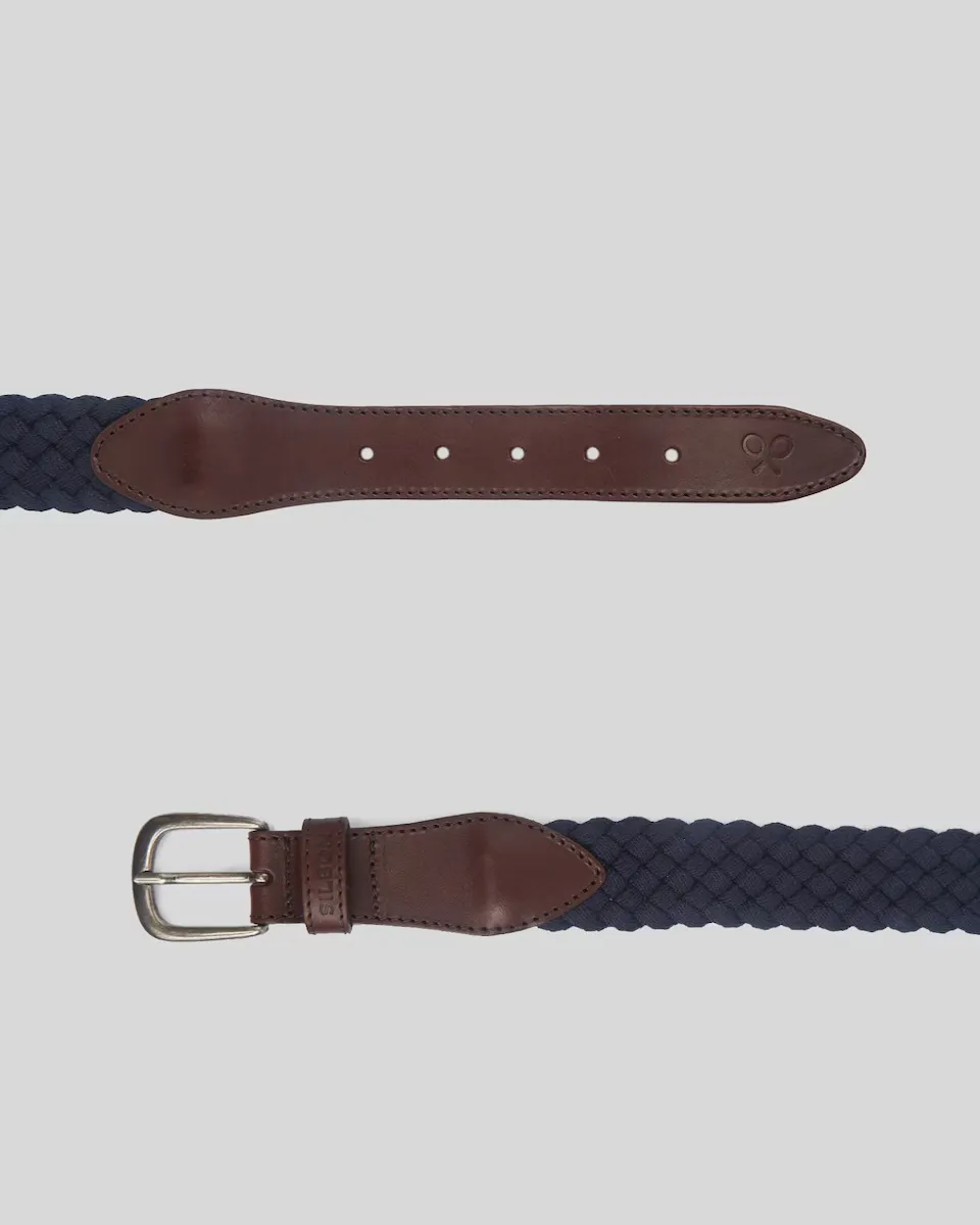 Плетеный ремень темно-синего цвета с кожаными концами. Обладает пряжкой цвета состаренного серебра, персонализацией на пряжке и тиснеными ракетками на конце. Изготовлено в Испании.