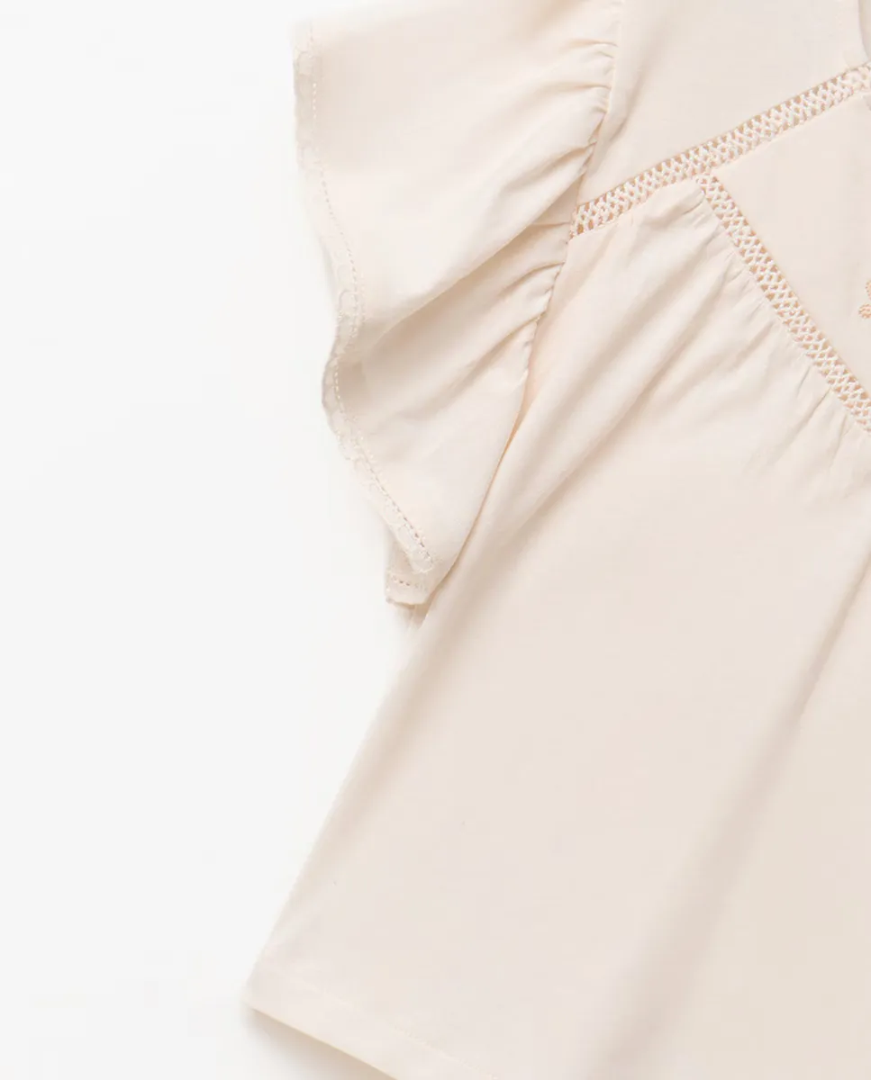 Футболка с коротким рукавом и рюшами. Застежка на пуговицу сзади. 100% хлопок