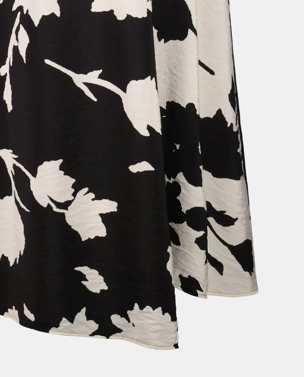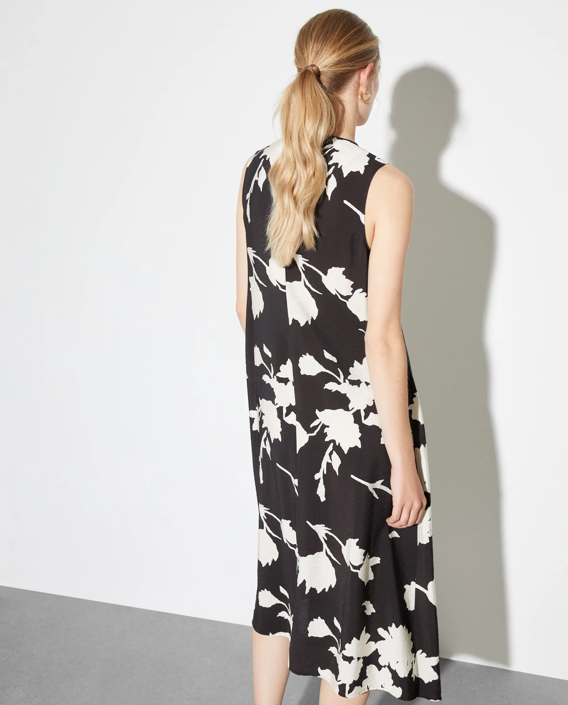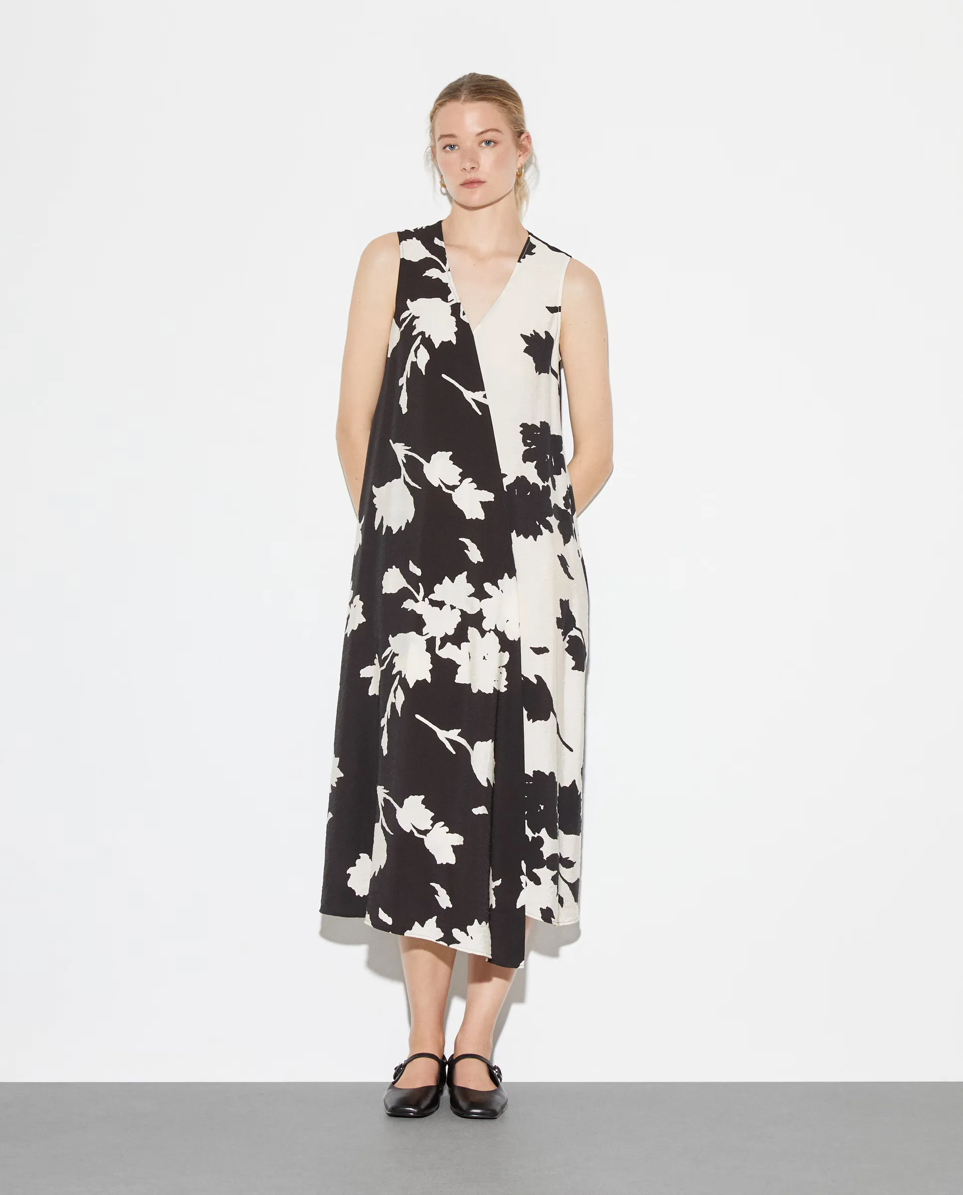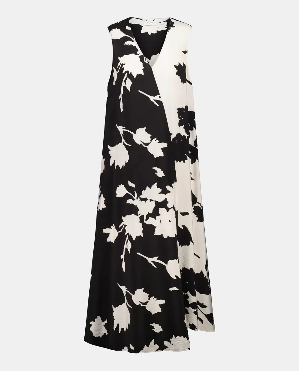 Ассиметричное миди-платье без рукавов с цветочным принтом.