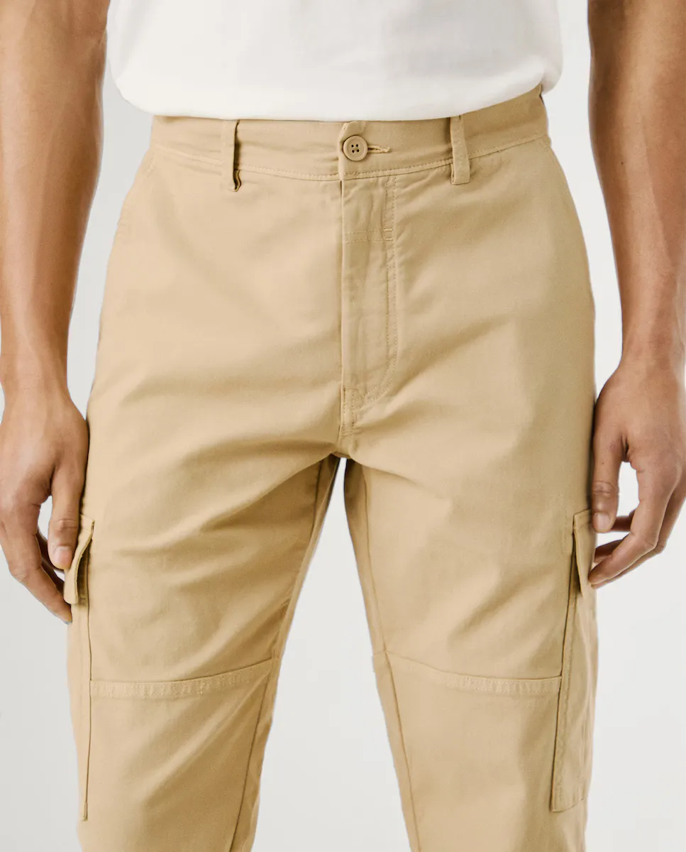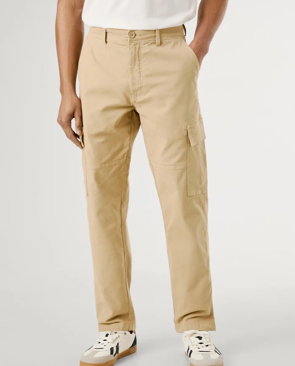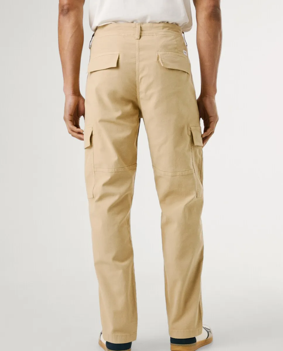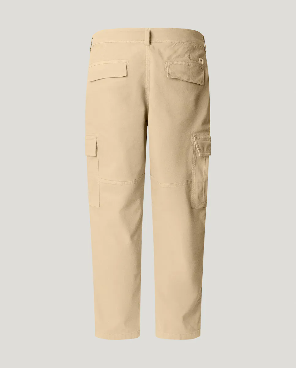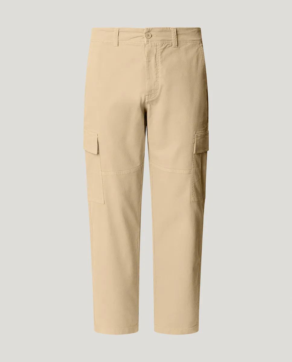 Штаны карго из эластичного холста с обычной посадкой, с итальянскими карманами, боковыми накладными карманами с клапаном, задними накладными карманами с клапаном и застежкой на молнии и кнопке. Каменный стирка и окрашивание в изделии, внутренняя талия с логотипом, напечатанным по всей длине, и бирка с логотипом PEPEJEANS на заднем кармане. Изготовлено на 100% из устойчивого хлопка.