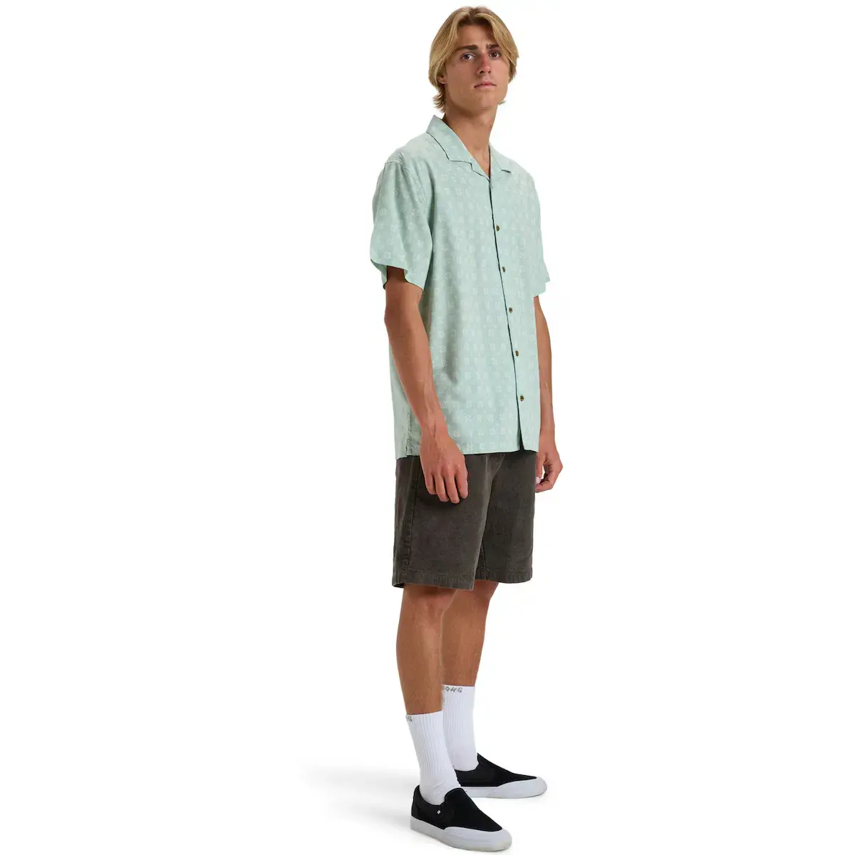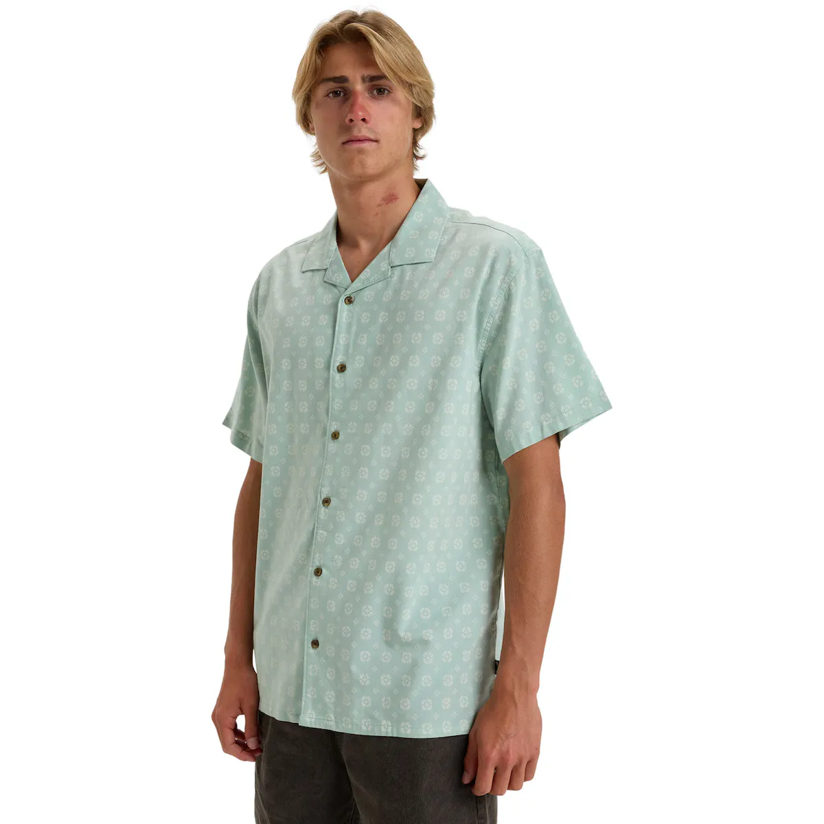 Рубашка с коротким рукавом для мужчин. Характеристики включают: Ткань: смесовая ткань из вискозы и хлопка, Рукава: короткие, Застежка: на пуговицах, Бренд: сезонный принт и Прямой низ.