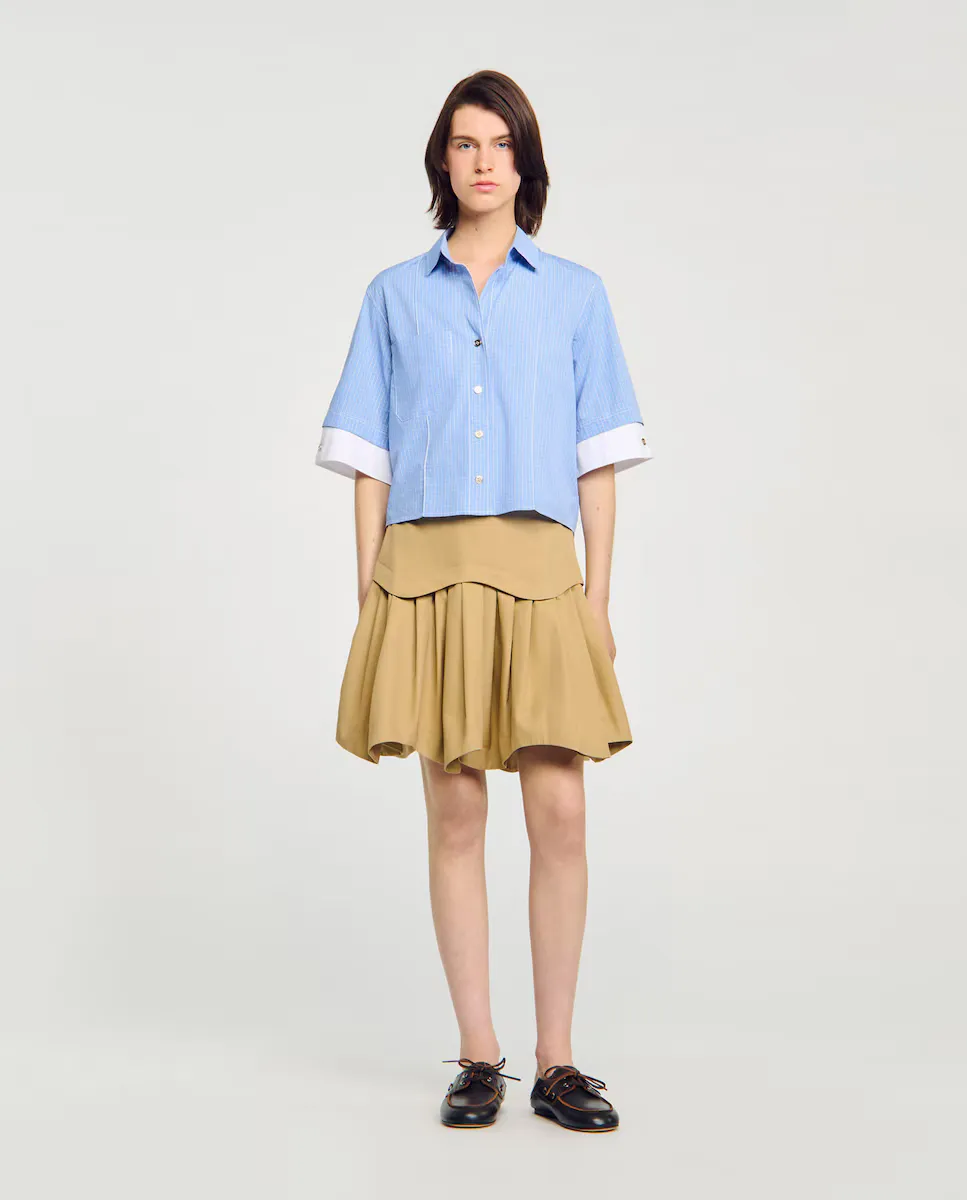 Короткая рубашка в мелкую клетку с воротником, короткими рукавами, застежкой на пуговицы и деталью в виде треугольной планки с пуговицей на спине. Рубашка в мелкую клетку Sandro для женщин. Воротник. Короткие рукава. Застежка на пуговицы. Накладной карман на груди. Контрастные манжеты с пуговицами. Треугольная планка с пуговицей на спине.