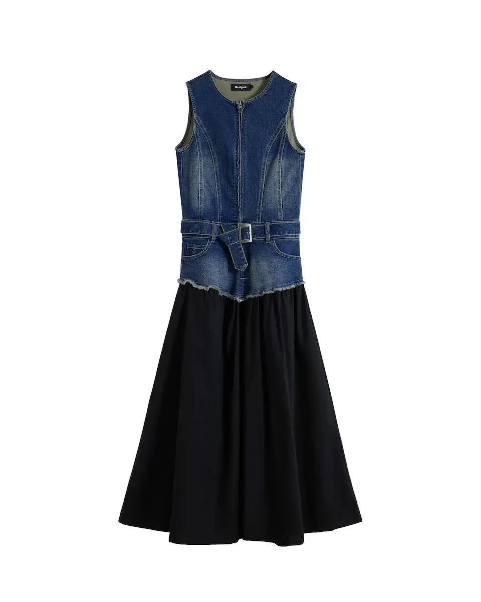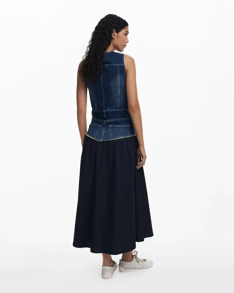 Миди платье без рукавов, с круглым вырезом и поясом из денима, с юбкой из однотонного поплина. Цвет: Однотонный. Крой: Приталенный. Без рукавов. Длина: Миди. Застежка: на молнии. Юбка из поплина. При покупке продукции из хлопка от Desigual вы поддерживаете наши инвестиции в Better Cotton. Этот продукт производится через систему массового баланса и может не содержать Better Cotton. bettercotton.org/massbalance..