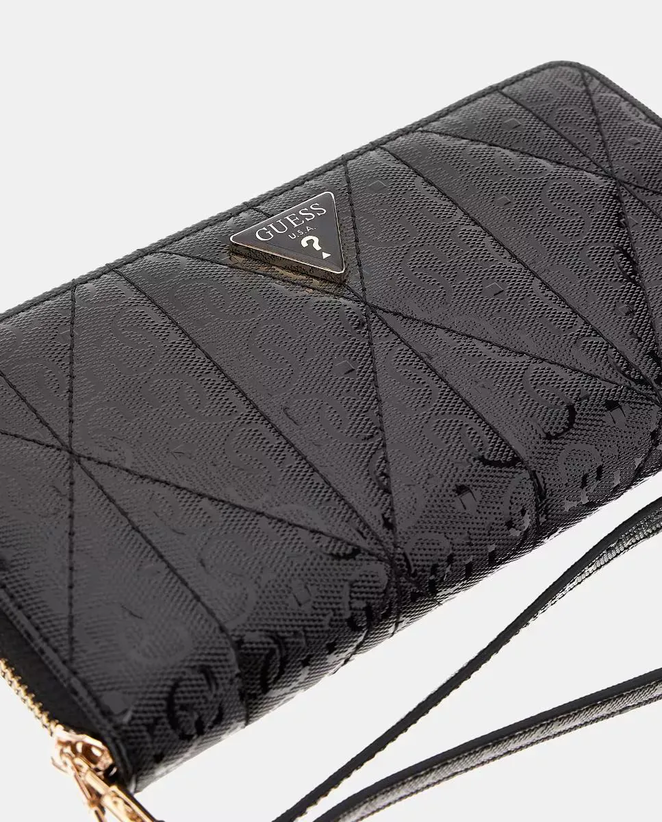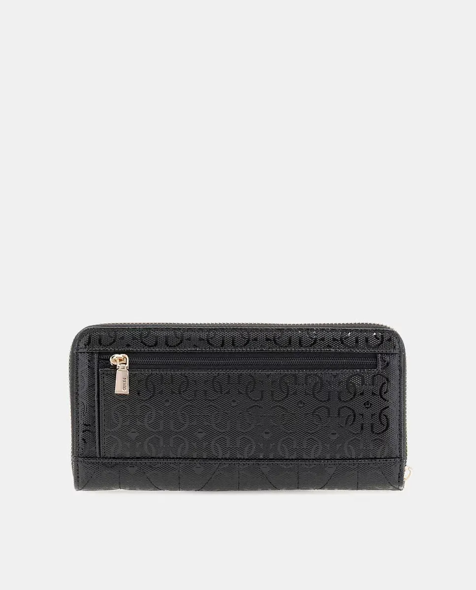 Модель кошелька Aldina с логотипом 4g на лаковой коже, с застежкой-молнией и металлическим логотипом спереди золотистого оттенка, отделениями для карт, внутренним карманом для монет и внешним карманом на молнии сзади.