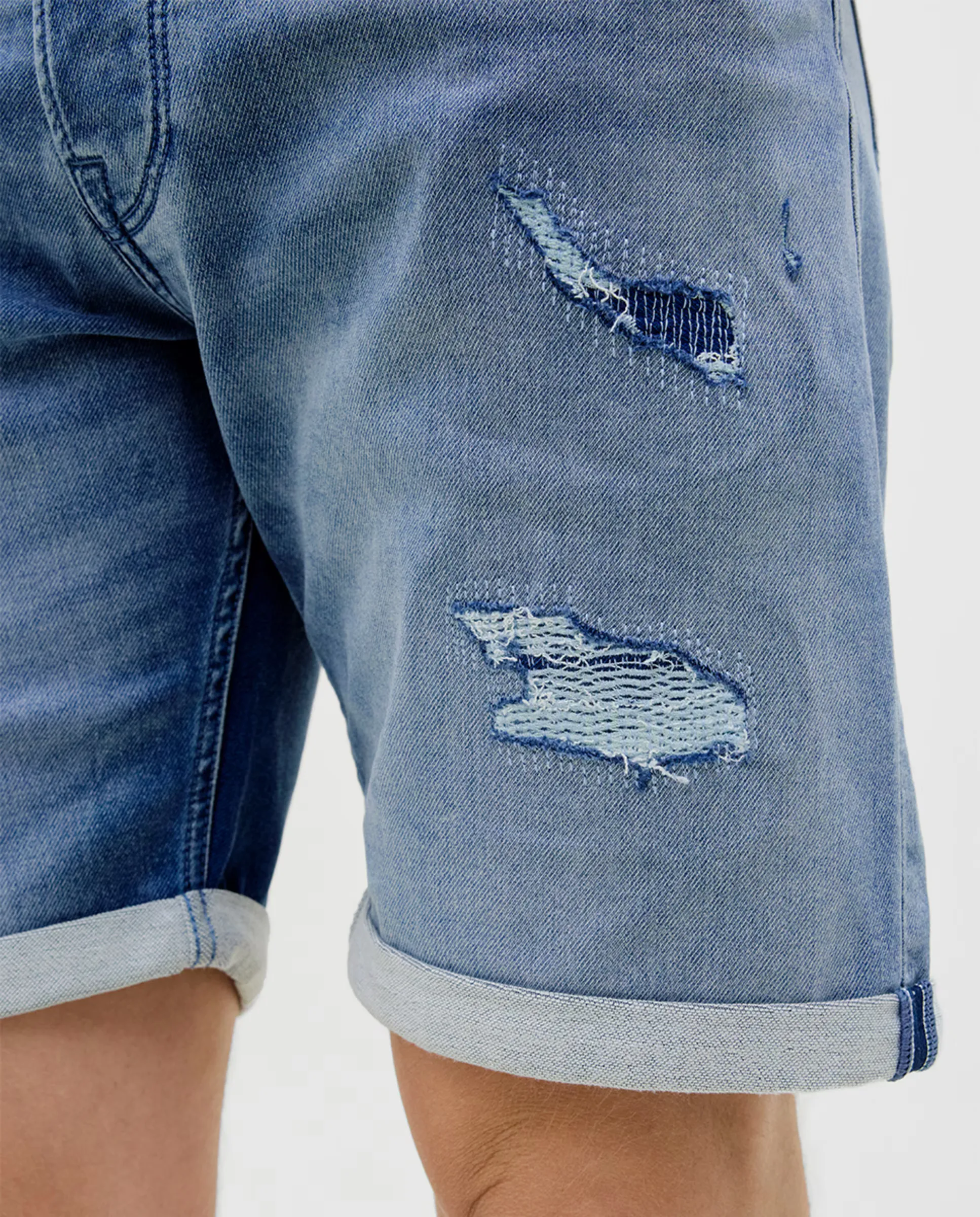 Бермуды обычного кроя с деталями отремонтированных прорезей, средней посадки и классическим кроем с пятью карманами. Застежка спереди на молнии и пуговице.