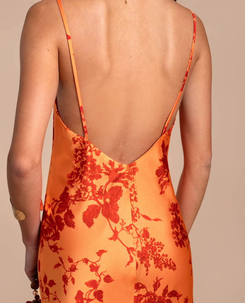 Сатиновое платье-комбинация, вырезанное по косой, чтобы красиво драпироваться. Сшито из сатиновой ткани с цветочным принтом, которая контрастирует на фоне, цветовая комбинация, с которой вы не ошибетесь. Имеет тонкие регулируемые бретели, которые полностью открывают спину.
