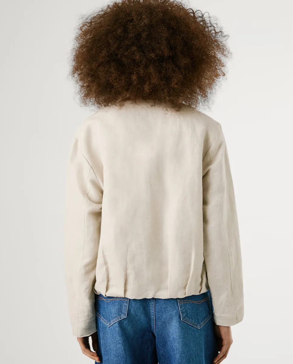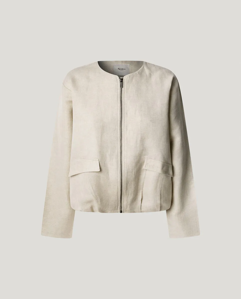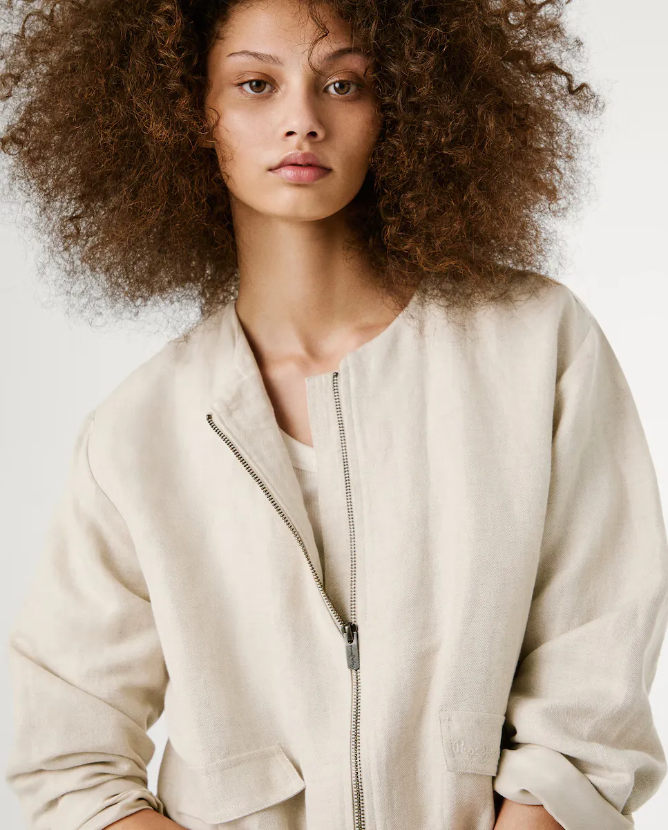 Бомбер из ткани в елочку, выполненный из смеси льна и хлопка, с круглым вырезом, застежкой-молнией спереди и боковыми карманами с клапаном. Свободный крой с рифленым подолом, внутренняя подкладка с полосатым рисунком и вышитый логотип PEPEJEANS в тон на боковом кармане.