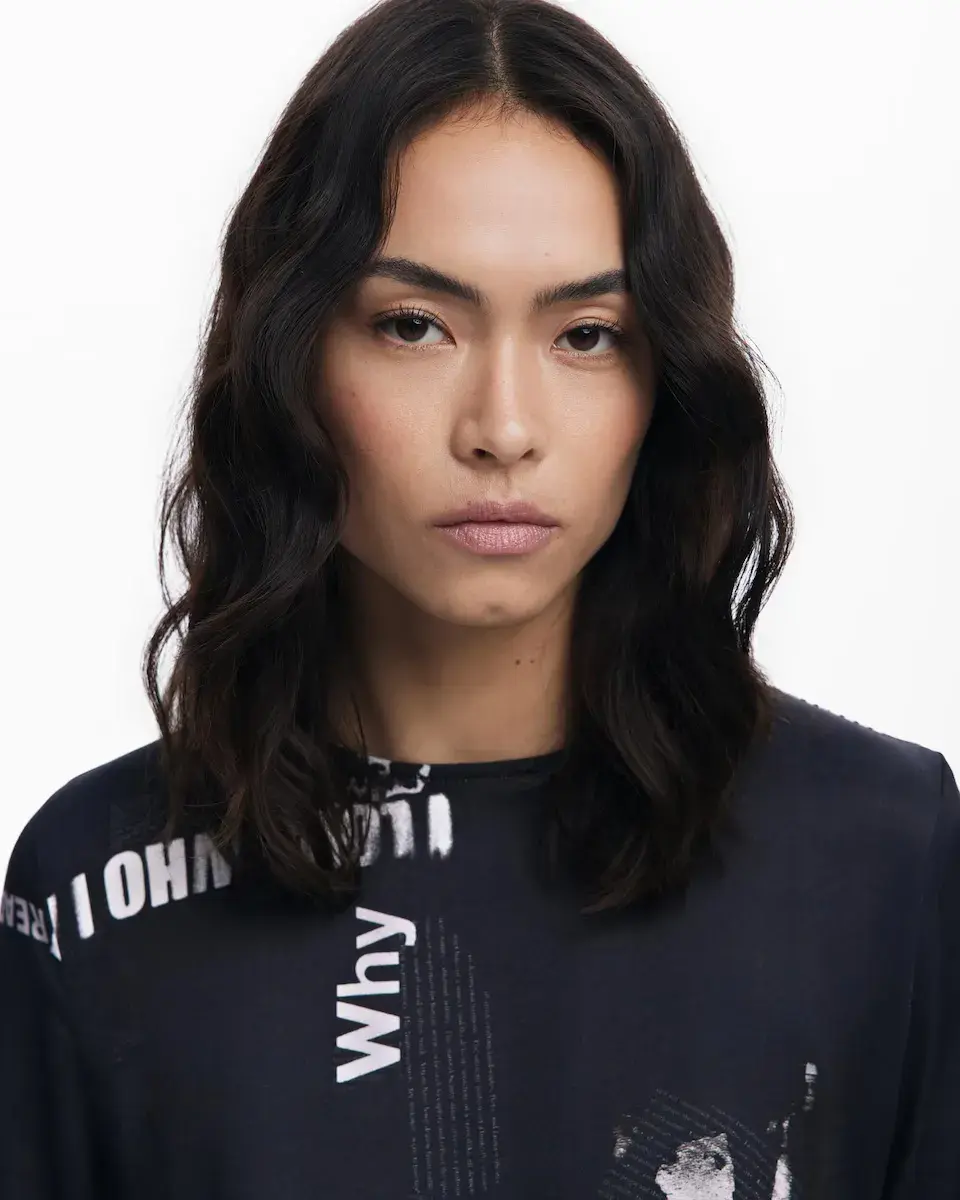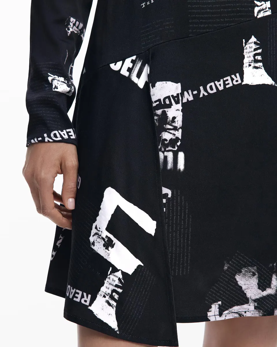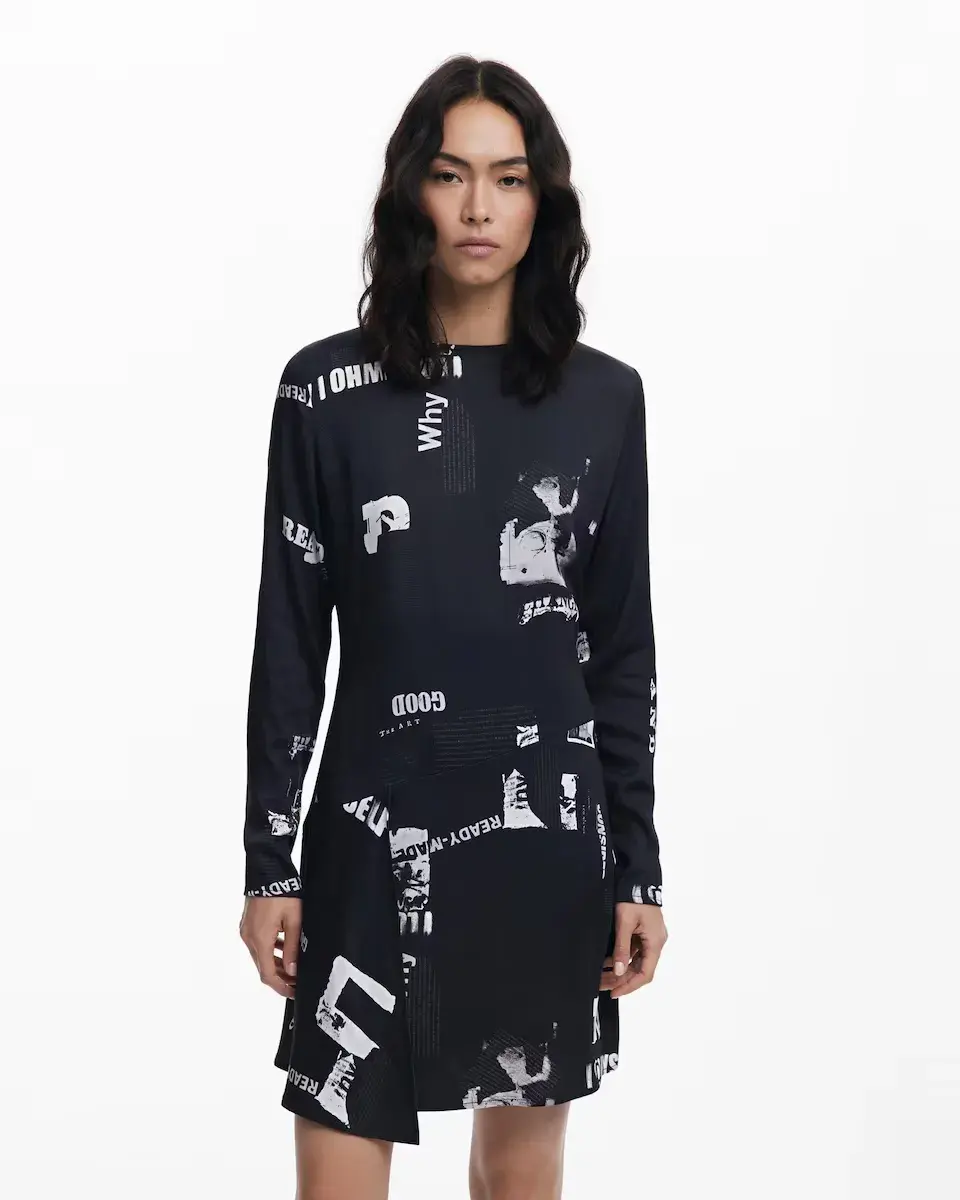 Короткое приталенное платье с асимметричным подолом, длинными рукавами и круглым вырезом с газетным принтом. Газетный принт. Крой: Стройный. Рукав: Длинный. Длина: Короткая. Застежка: на молнии. Вискоза Lenzing EcoVero.