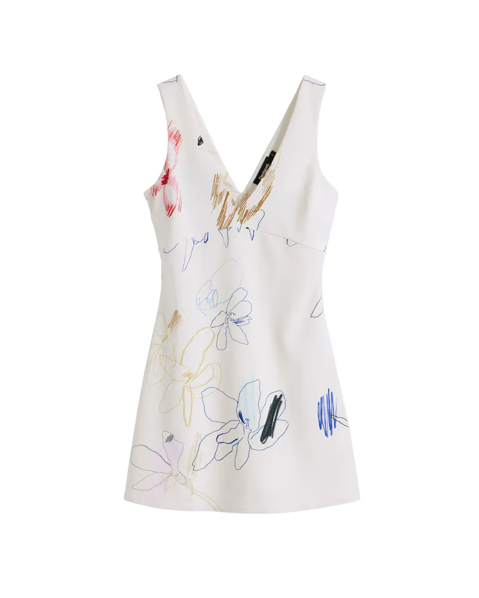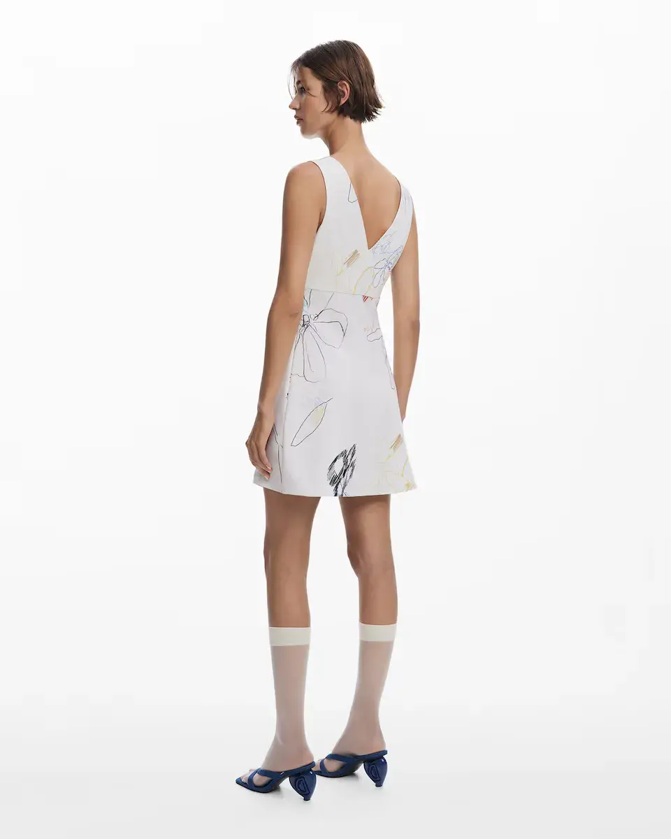 Короткое платье в стиле пити с безрукавным дизайном, V-образным вырезом и принтом с разными цветными линиями. Принт Arty. Крой: обычный. Без рукавов. Длина: короткая. Застежка: на молнии. Переработанный полиэстер.