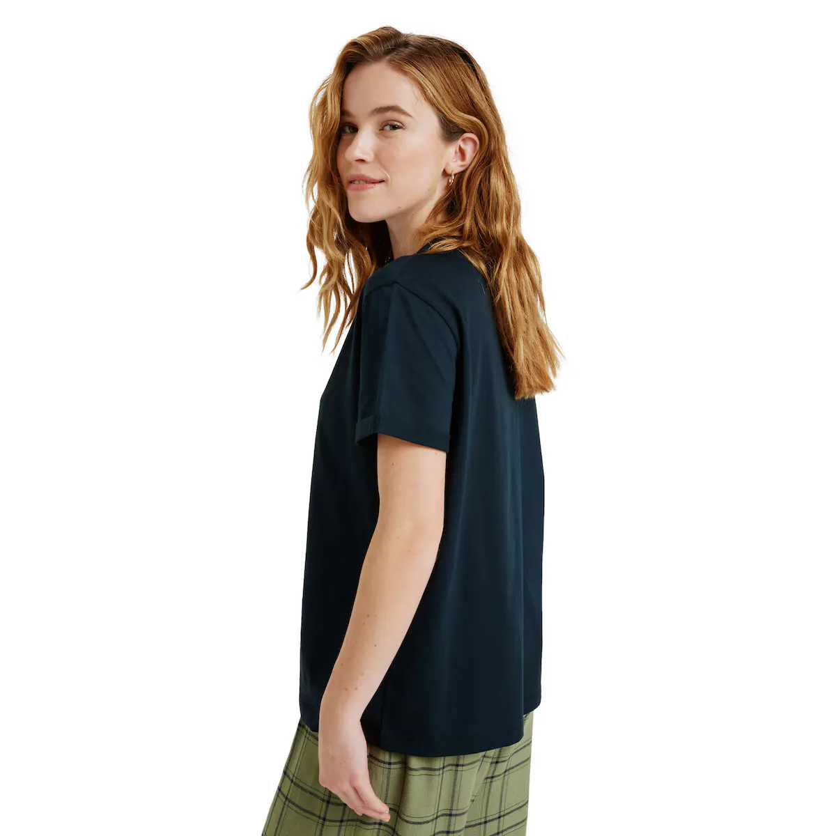 Футболка с короткими рукавами для женщин. Характеристики включают: Материал: органический хлопок, Стирка: стирка в изделии био, Крой: обычный, Воротник: круглый воротник, Ребристый воротник и Сериграфия на передней части.