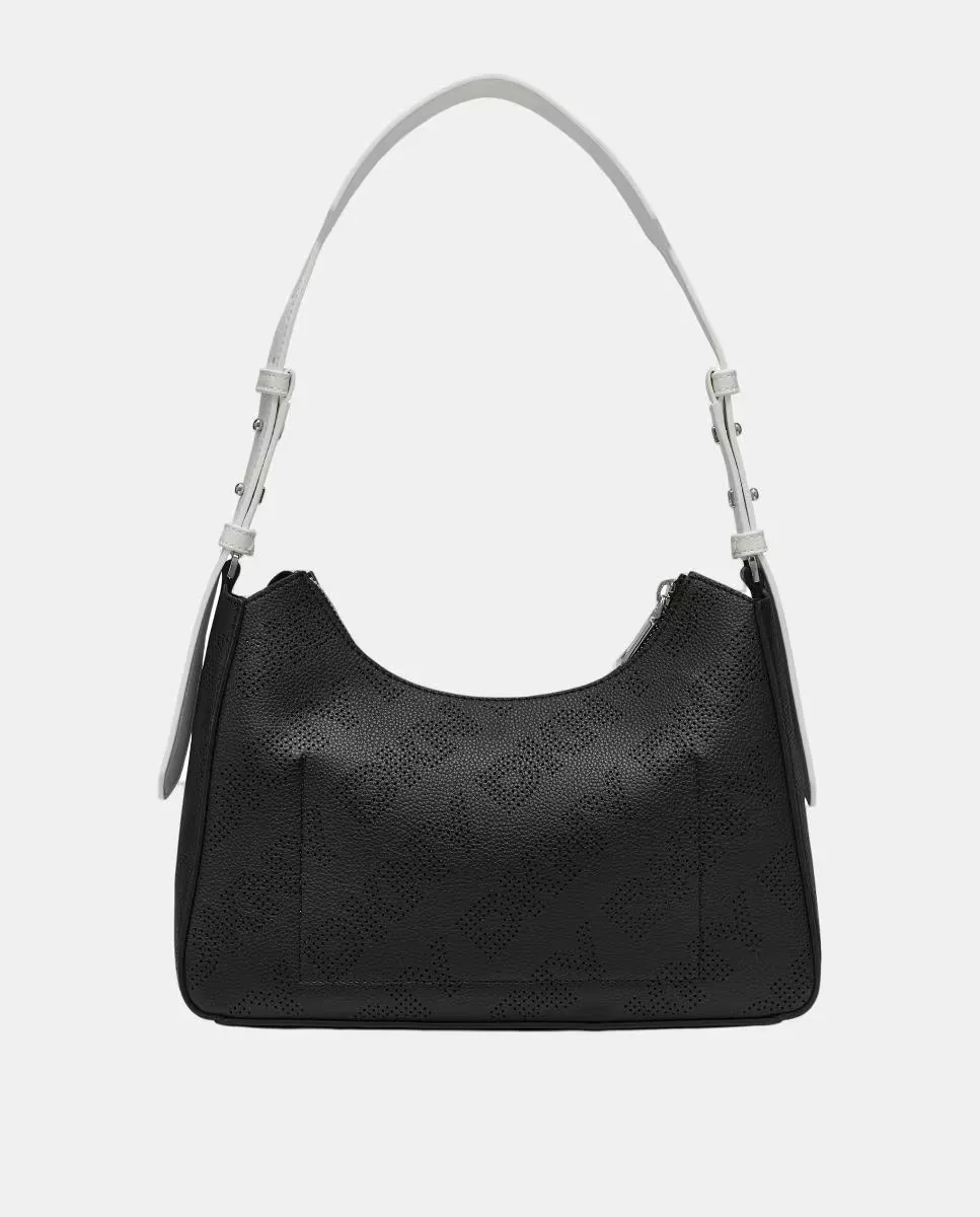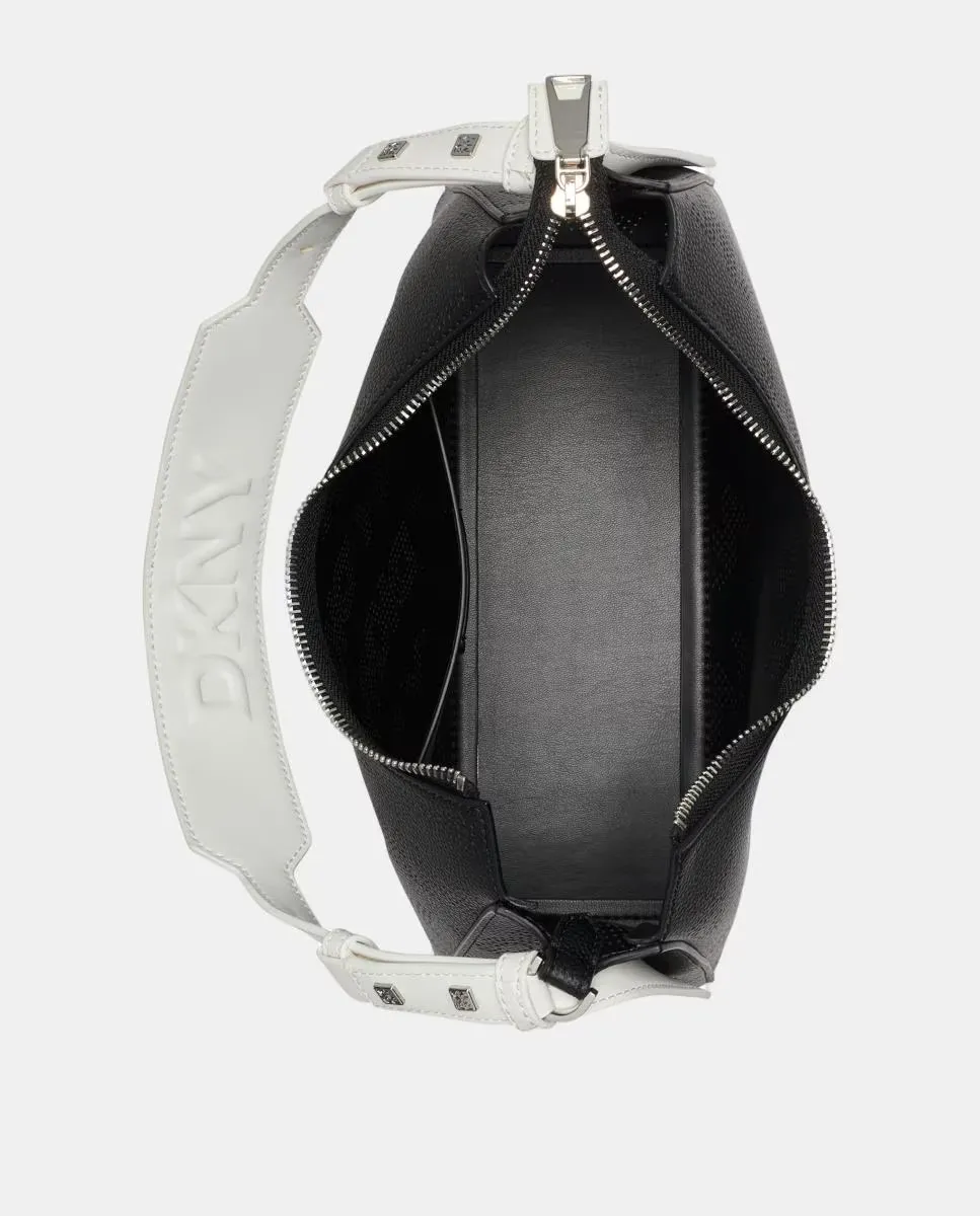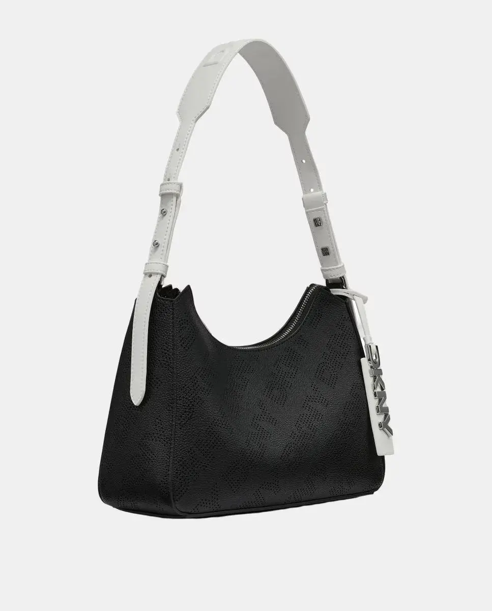 Сумка SHELLY через плечо с регулировочной контрастной ручкой. Принт с перфорированным логотипом DKNY. Застежка на молнии, включает брелок с логотипом.
