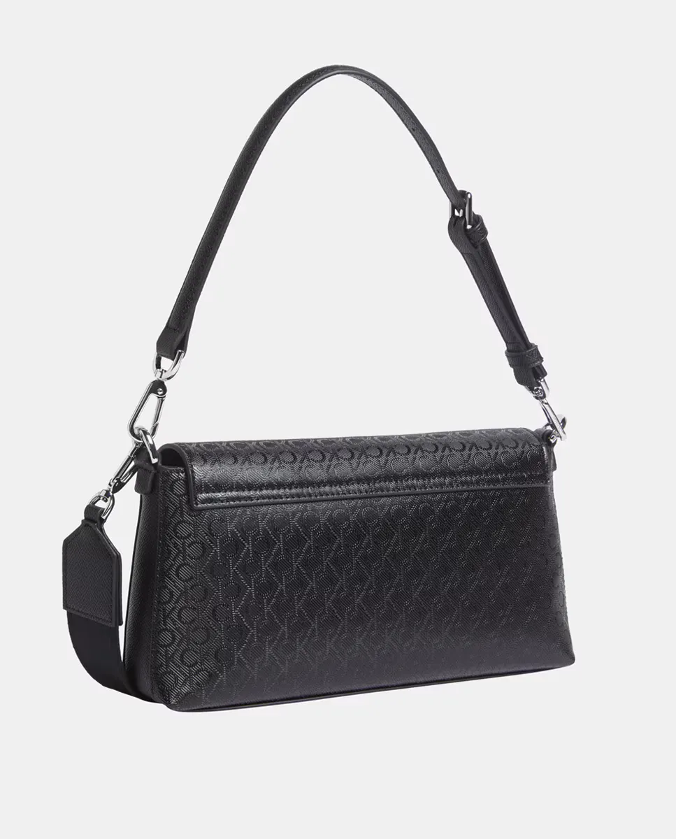 Сумка через плечо Boldo от Calvin Klein с монограмным принтом, клапанным закрытием, двойными съемными ремнями и металлическим логотипом на клапане.