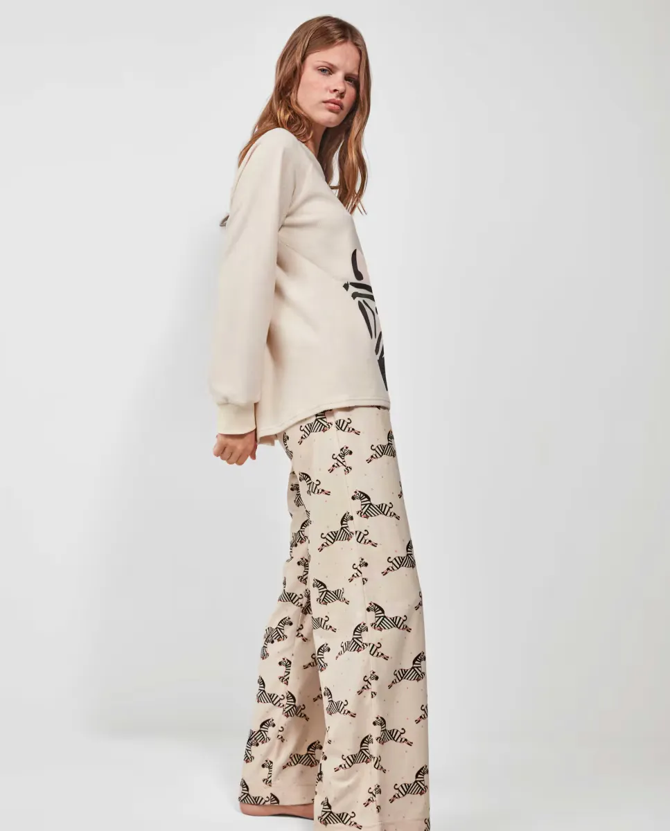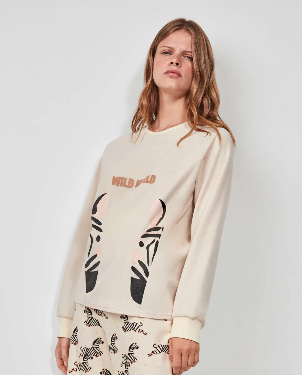 Пижама с распечаткой из микрополара с рубашкой с длинным рукавом и принтом с обеих сторон. Широкие брюки с принтом и регулируемой талией.