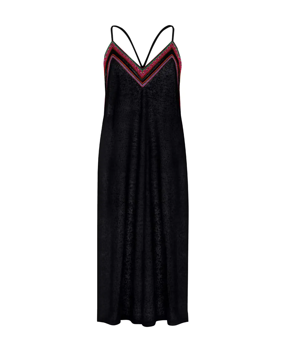 Платье с инкской отделкой имеет выразительный кокетливый вырез по бокам, а также разрез на ноге с одной стороны.