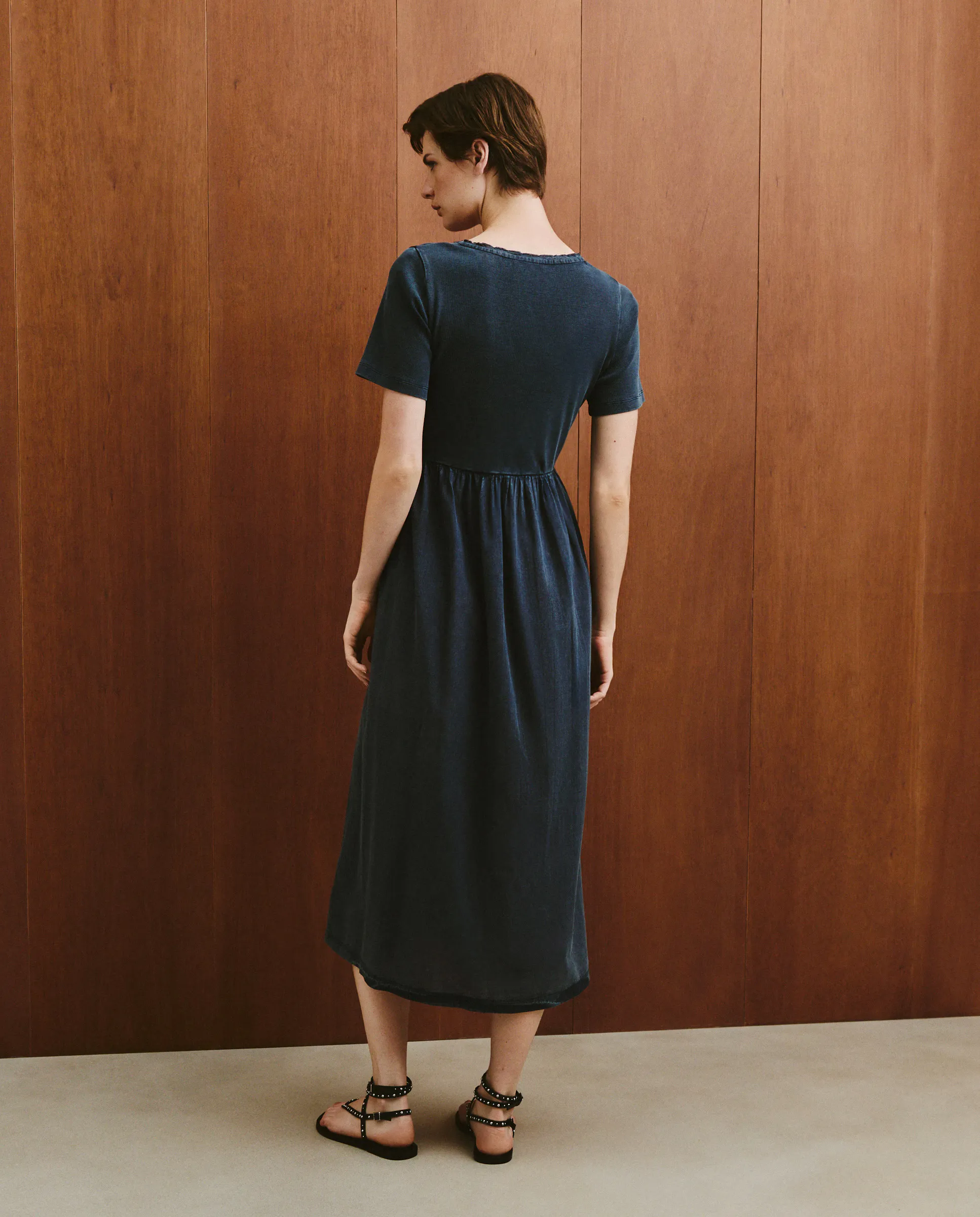 Однотонное длинное трикотажное платье с короткими рукавами.