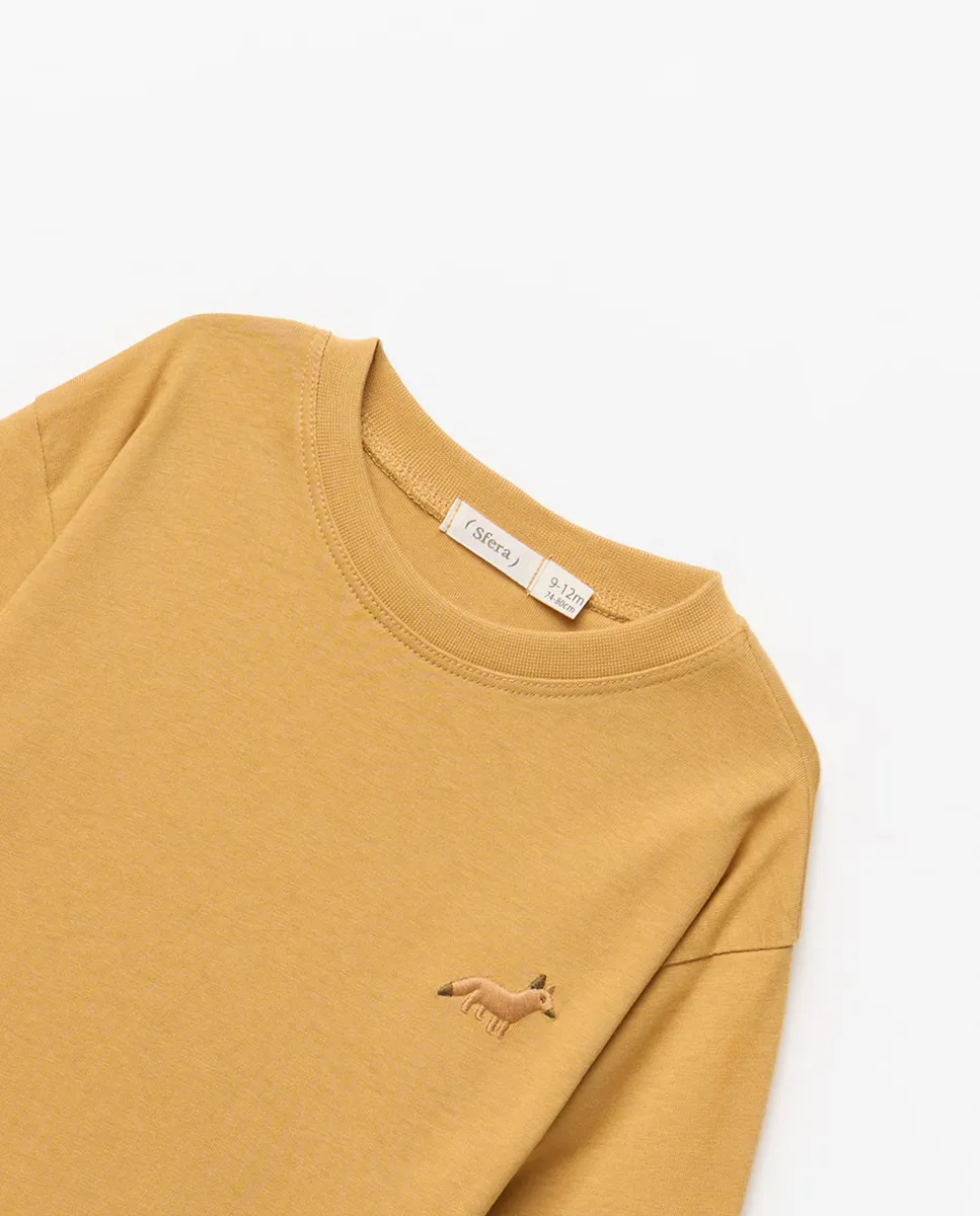 Однотонная футболка с длинными рукавами и круглым вырезом с вышивкой. 100% хлопок.