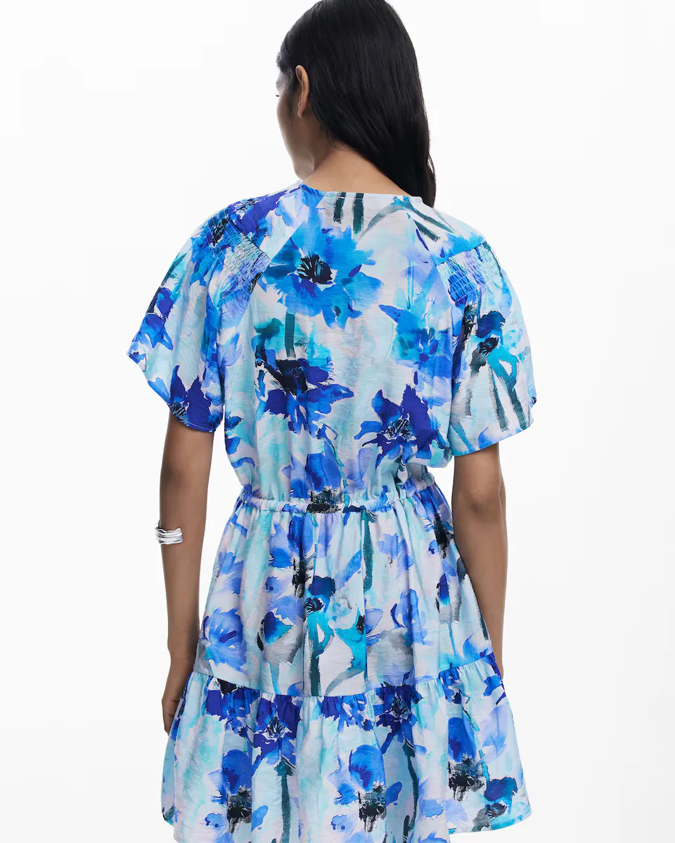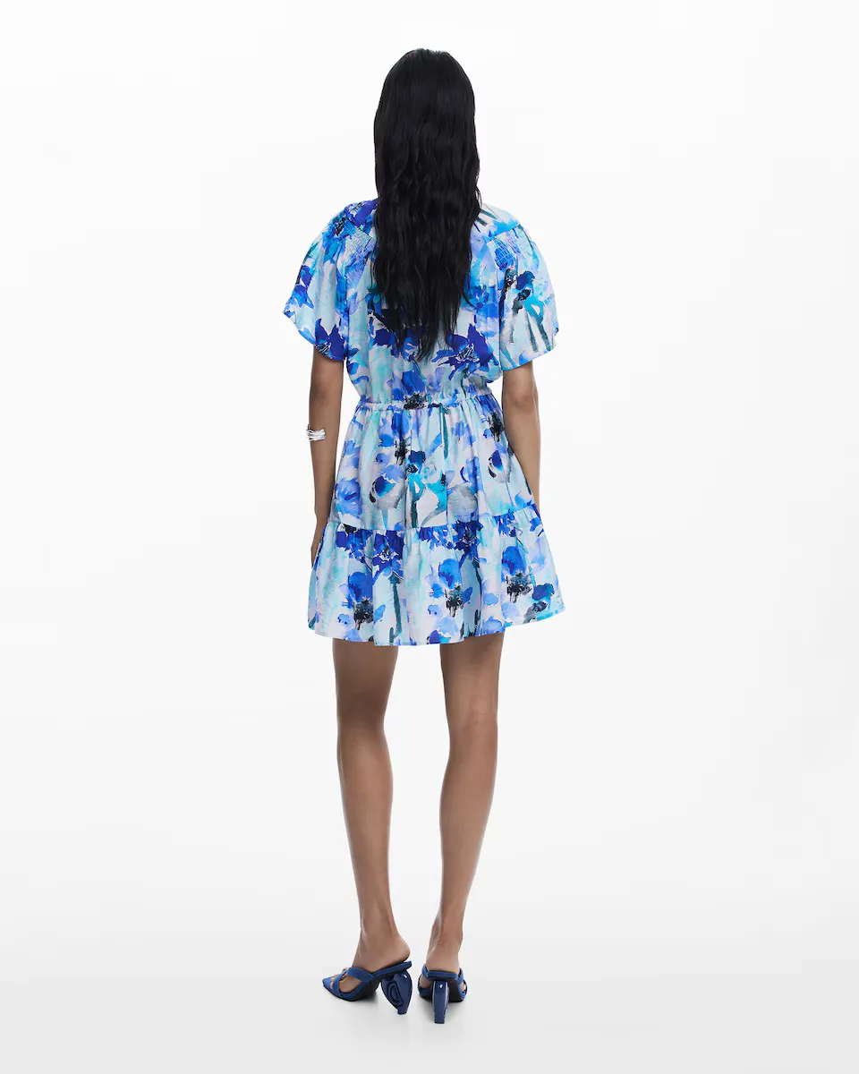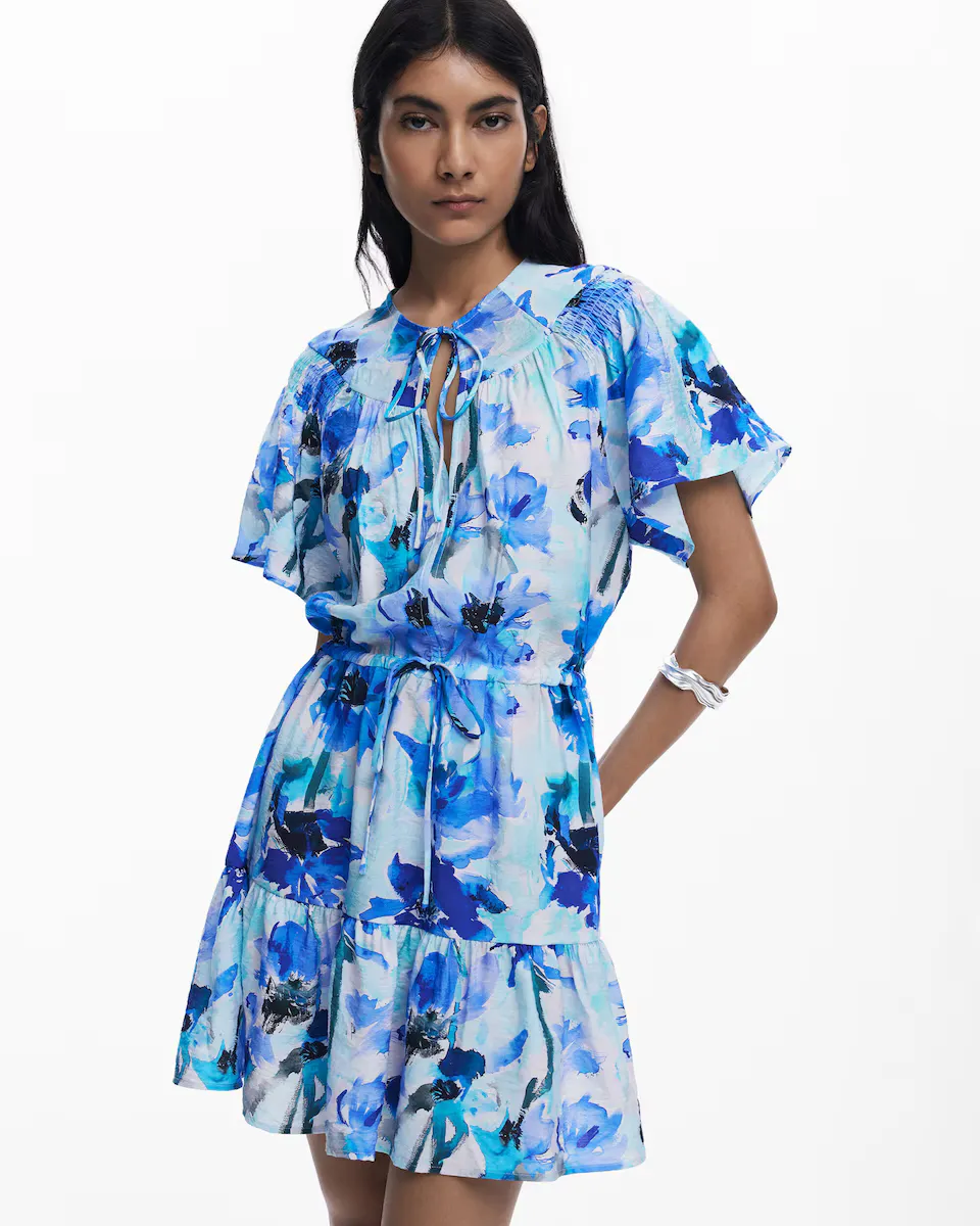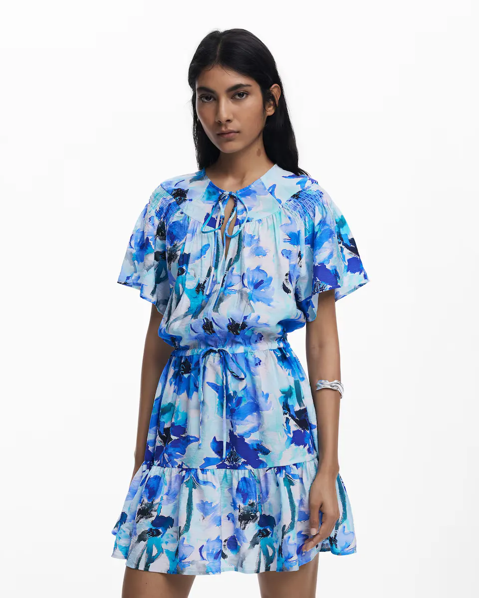 Короткое струящееся платье с короткими рукавами в стиле бабочки, с V-образным вырезом, деталью с бантом на талии, оборками внизу и цветочным принтом. Цветочный принт. Крой: обычный. Рукав: короткий. Длина: короткая. Закрытие: на шнуровке. Оборка внизу. Вискоза Lenzing Livaeco.