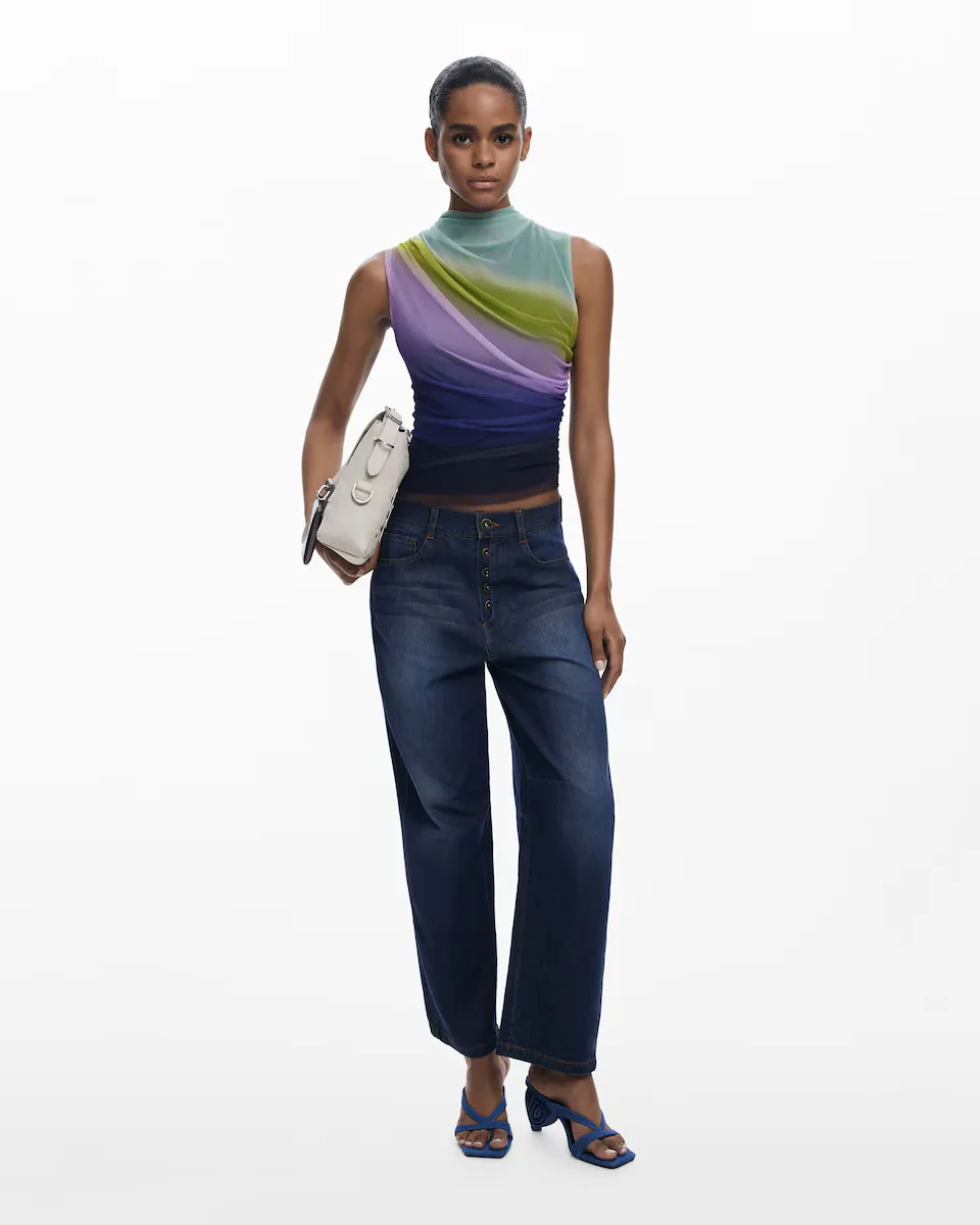 Топ из драпированного тюля, без рукавов, с чуть приподнятым воротником и принтом с градиентными цветами. Градиентные цвета. Крой: обычный. Без рукавов. Переработанный полиэстер.