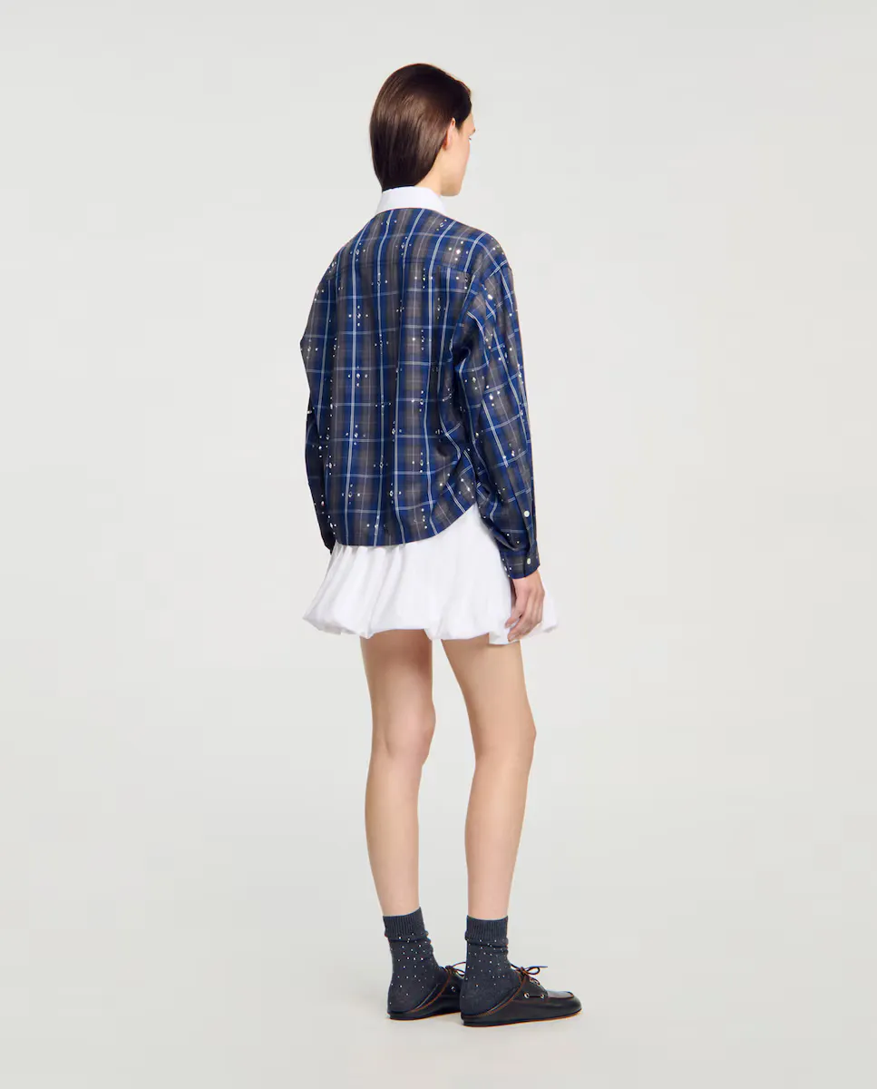 Рубашка в клетку с стразами по всей поверхности, контрастный воротник, длинные рукава с застежкой на пуговицу и пуговичным закрытием. Рубашка в клетку Sandro для женщин. Стразы по всей поверхности. Контрастный воротник. Длинные рукава. Застежка на пуговицу. Пуговичное закрытие. Широкий крой.
