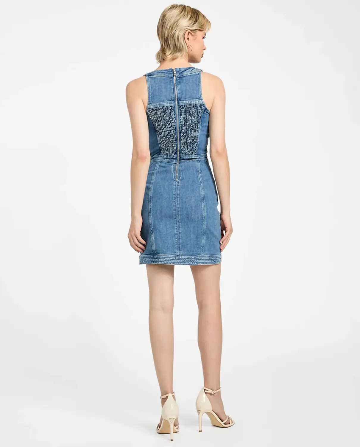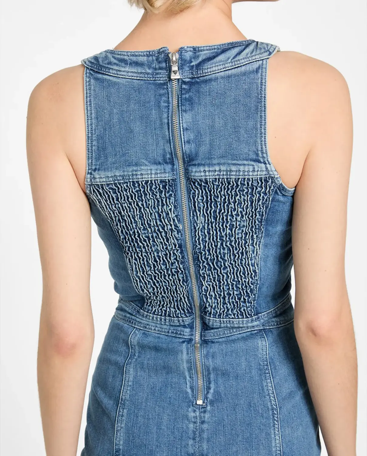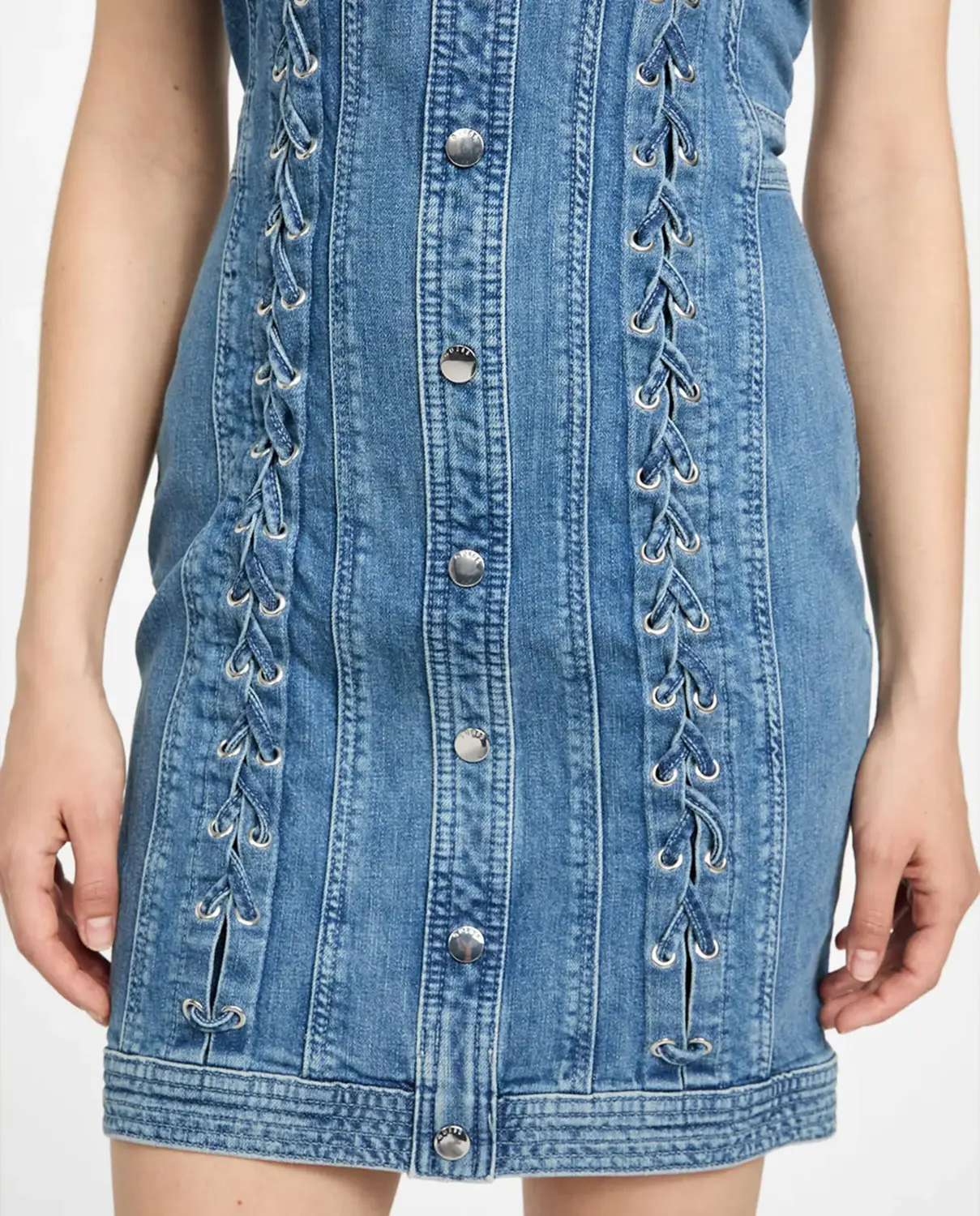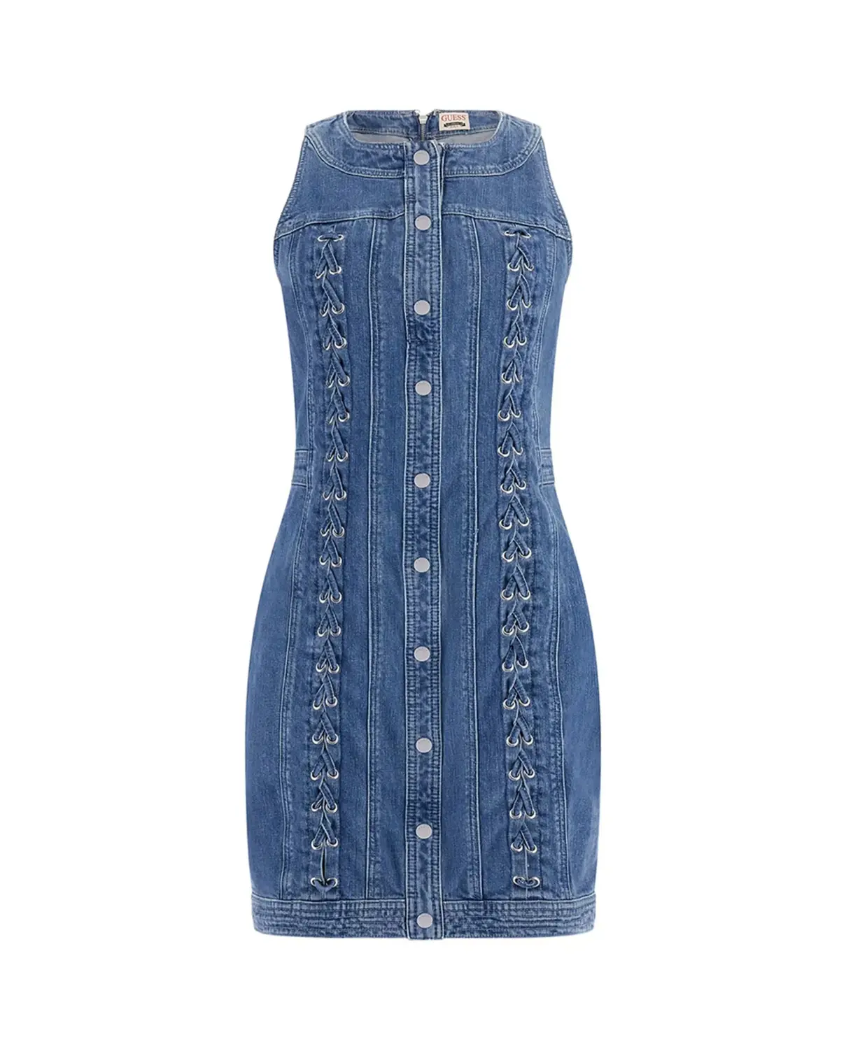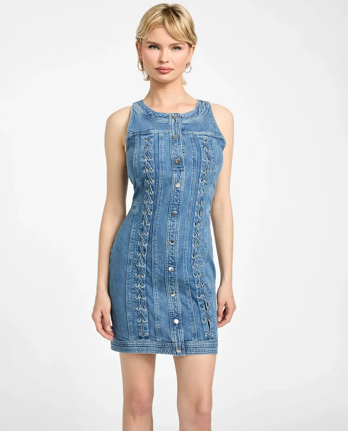 Короткое облегающее платье без рукавов, сшитое из денима. Оно имеет декоративные завязки, которые проходят от конца до конца спереди. Включает пуговичный застежку спереди, что дополняет его структурированный дизайн.
