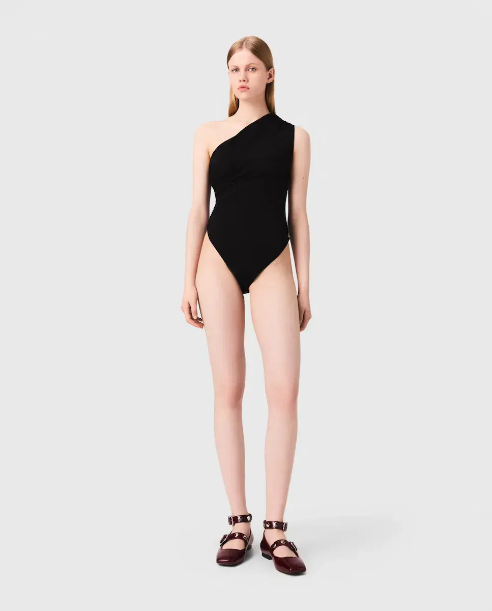 Асимметричное тело, драпировавшееся на плечах и по бокам. Застежка на пуговицах. Эта коллекция, вдохновленная концом лета, вызывает образы женщины между Сен-Тропе и Кассисом. Воспоминания о детстве и рынках Прованса сочетаются с простотой и элегантностью с помощью вечных, легких вещей, идеально подходящих для перехода к возвращению в школу. Это тело играет с асимметрией благодаря драпировке на плече и по бокам. Разработано как сильная вещь в гардеробе, подчеркивает грудь и идеально сочетается с юбкой или элегантными брюками.