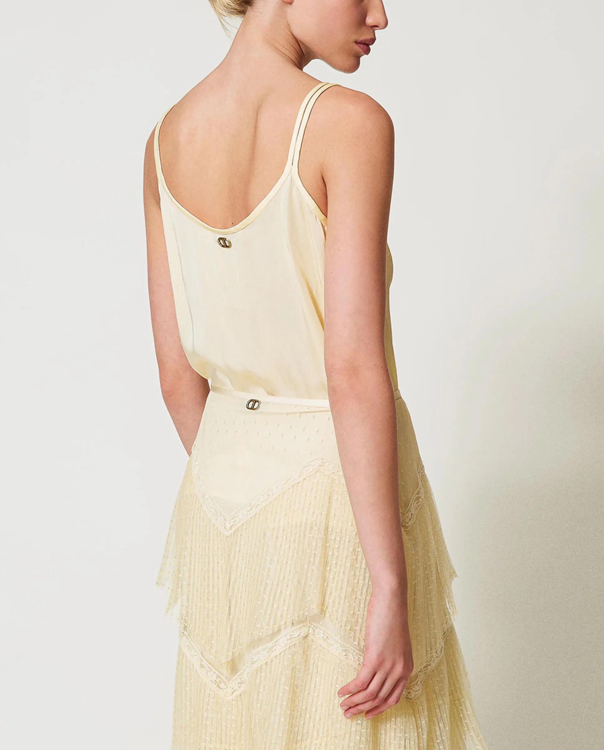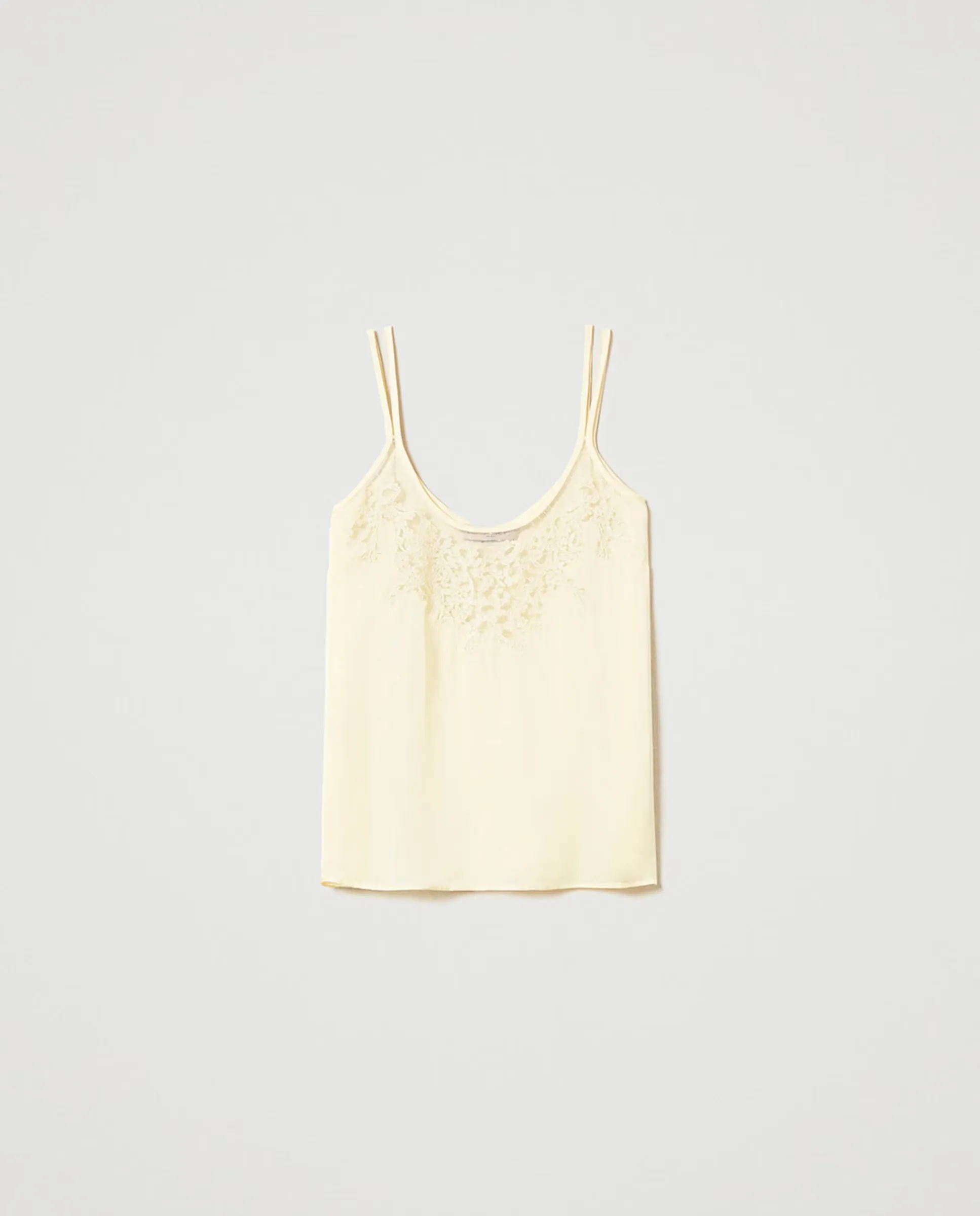 Топ из вискозного сатина с вышивкой, расположенной на вырезе, выполненной на основе сетки с рисунком листьев и цветов. Имеет двойные бретели, широкий вырез, пластину с логотипом Oval T на спине и свободный крой.