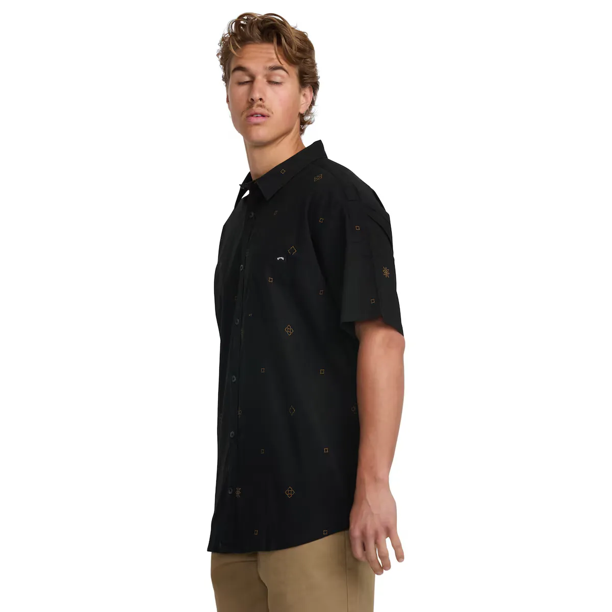 Футболка с короткими рукавами для мужчин. Характеристики включают: Ткань: смесовая ткань из хлопка и лиоцелла, Рукава: короткие рукава, Застежка: застежка на пуговицы, Карманы: карман на груди, Бренд: верх из ткани с принтом и механической эластичностью, Другие детали: сезонный принт с минимальными ярлыками, а внешний вид продукта может отличаться в зависимости от ситуации с принтом.