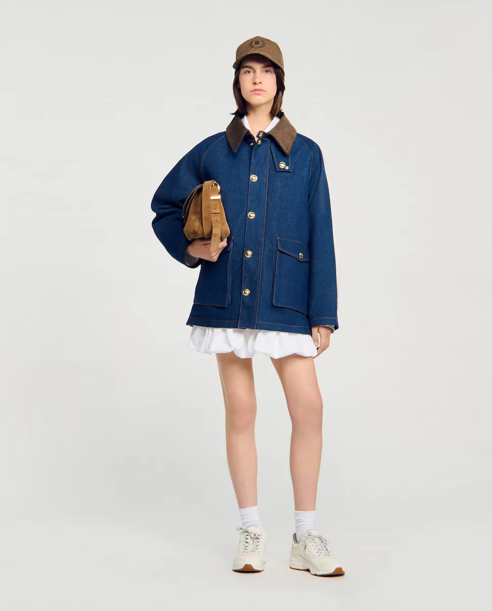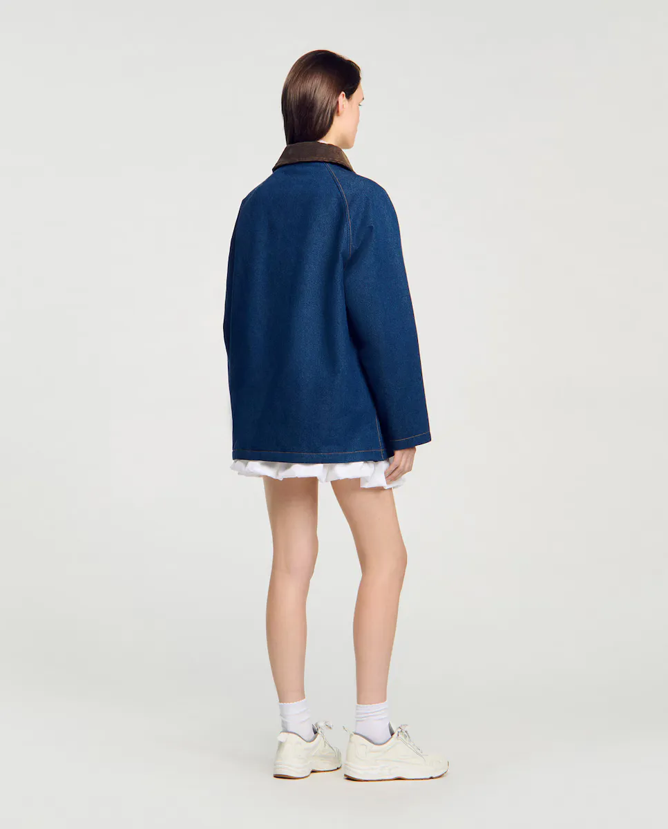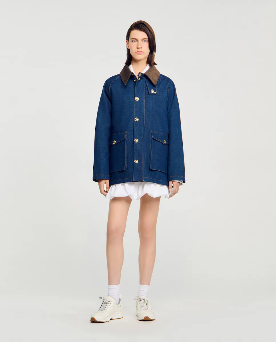 Джинсовая рабочая куртка, украшенная контрастным вельветовым воротником и оснащенная длинным рукавом, застежкой-молнией с накладной планкой и карманами. Рабочая куртка Sandro для женщин. Вельветовый воротник. Застежка-молния с накладной планкой. Боковые разрезы с кнопками внутри. Накладные карманы с клапаном и кнопкой. Внутри контрастная клетка.