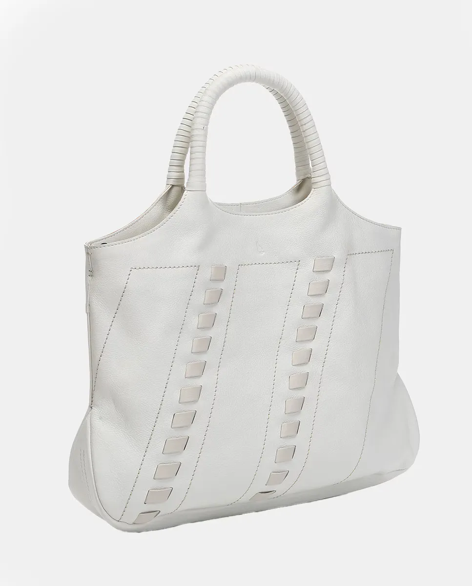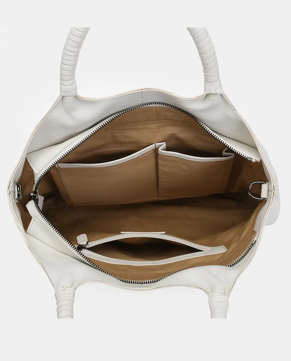 Сумка-шоппер из премиальной кожи. Модель, которая выделяется своим уникальным и изысканным дизайном. Её мягкие и нейтральные цвета делают её универсальным аксессуаром, очень легко сочетающимся как для повседневных, так и для официальных случаев. Дизайн включает детали из кожаных ремешков, проходящих по всей фронтальной поверхности, создавая оригинальный визуальный эффект. Контрастные тонкие швы добавляют изюминку, подчеркивая ремесленное качество изделия. Кроме того, её просторный интерьер идеально организован и полностью подкладен. Верхний замок на молнии. Эта сумка идеальна для тех, кто ищет эксклюзивный аксессуар, который сочетает в себе функциональность и стиль.
