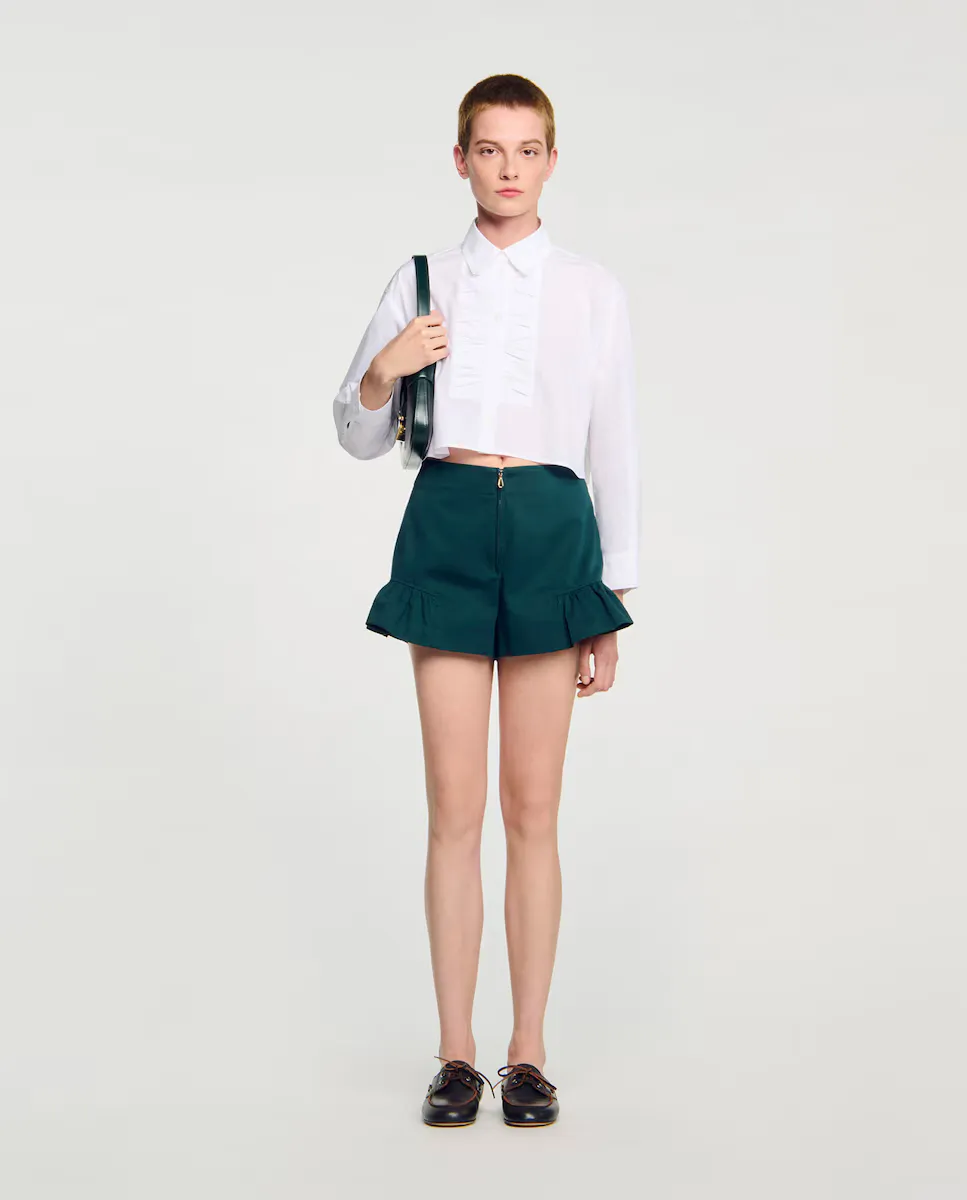 Шорты-колокол с рюшами, петлями для пояса и застежкой на молнии спереди. Шорты с рюшами Sandro для женщин. Петли для пояса. Застежка на молнии спереди. Средне-высокая талия.