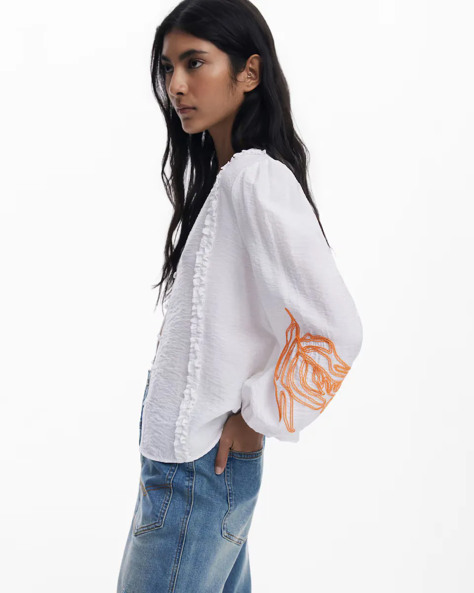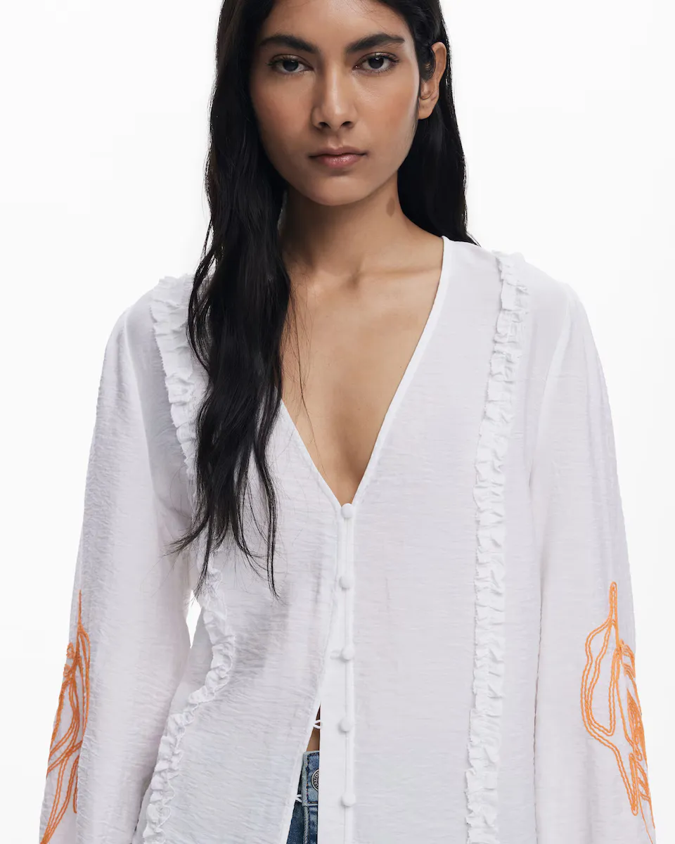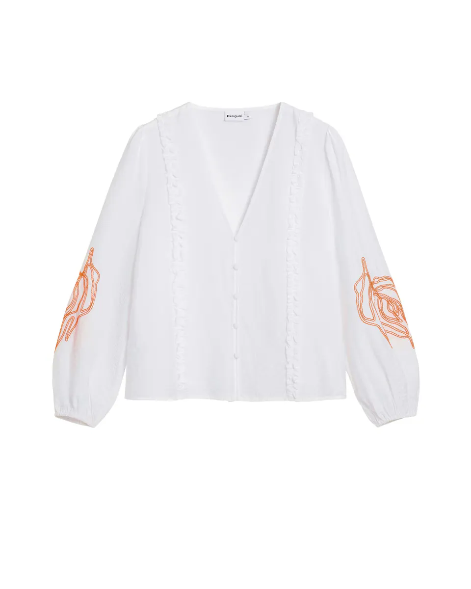 Блуза с шаровидным кроем и длинными рукавами, с V-образным вырезом, с пуговицами спереди, однотонного цвета с контрастной вышивкой на рукавах. Цвет: Однотонный. Крой: Шаровидный. Рукав: Длинный. Пуговичная застежка спереди. Вышитые детали на рукавах. Вискоза Lenzing EcoVero.