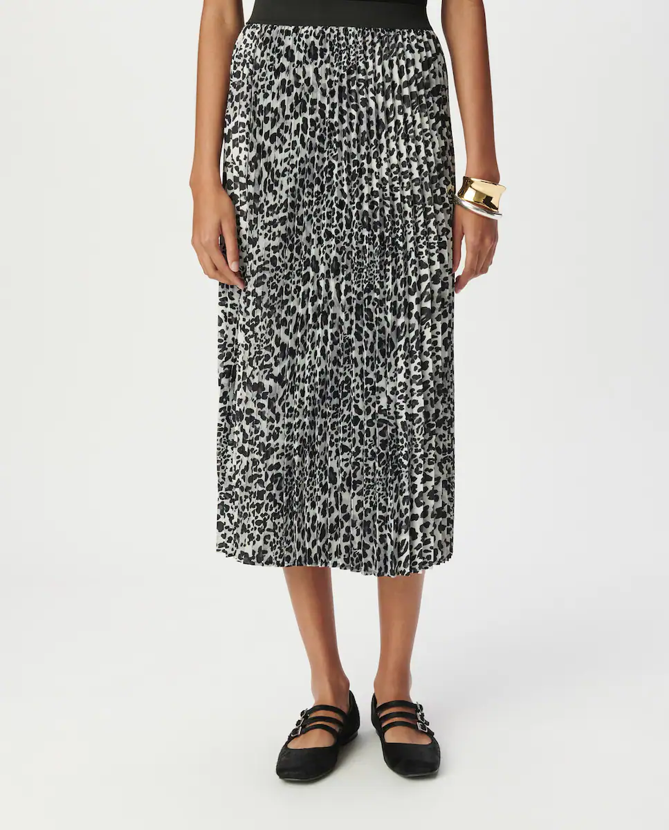 Юбка из серого перламутрового полиэстера для женщин, плиссированная с эксклюзивным рисунком пантеры IKKS. Эластичный пояс, широкая черная резинка. Расклешенный крой, миди-длина. IKKS actforbetter: материал содержит 100% переработанный полиэстер.