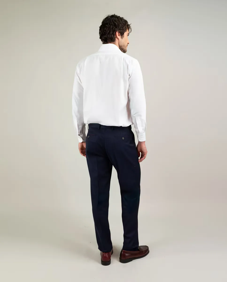 Одноцветные брюки, которые можно стирать в машине. Сшиты на 60% из шерсти. Стандартный крой. Застегиваются на скрытую молнию под планкой и пуговицу. Два боковых кармана, один для мелочи и задние карманы с отделкой. Петли для ремня. Поставляются с сетчатым пакетом и инструкцией по стирке.