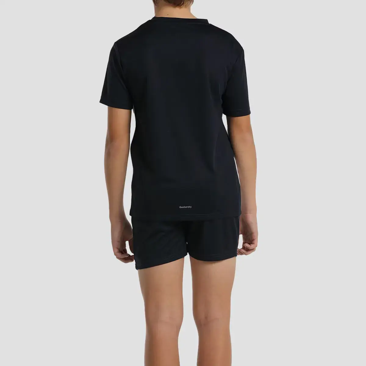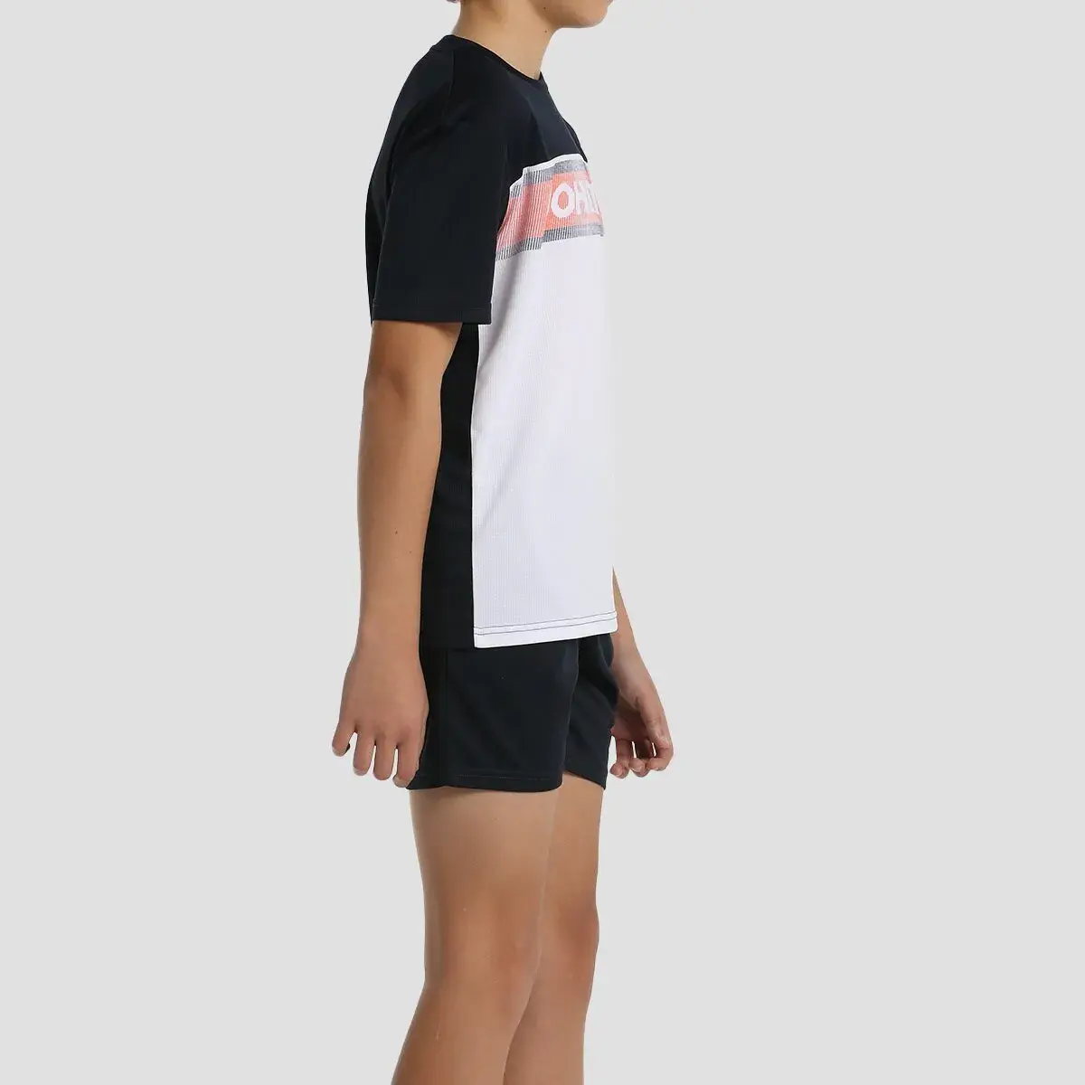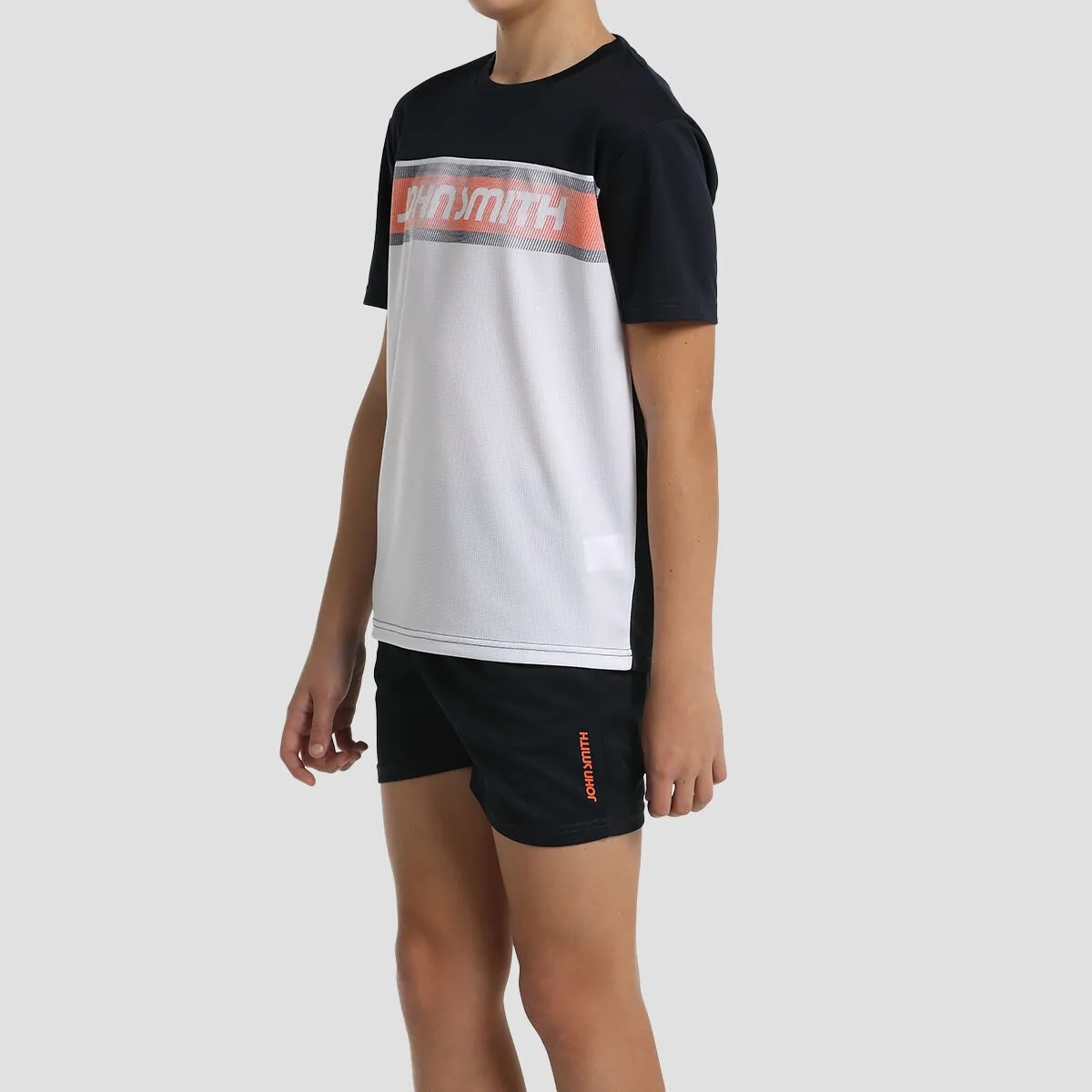 Комплект для мальчика с футболкой из модного полиэстера с сеткой. Футболка с нагрудником, контрастными рукавами, спинкой и горловиной. Графика на передней части. Бермуды из того же материала. Боковые карманы, эластичная талия и внутренний шнурок. Применено покрытие Quickerdry.