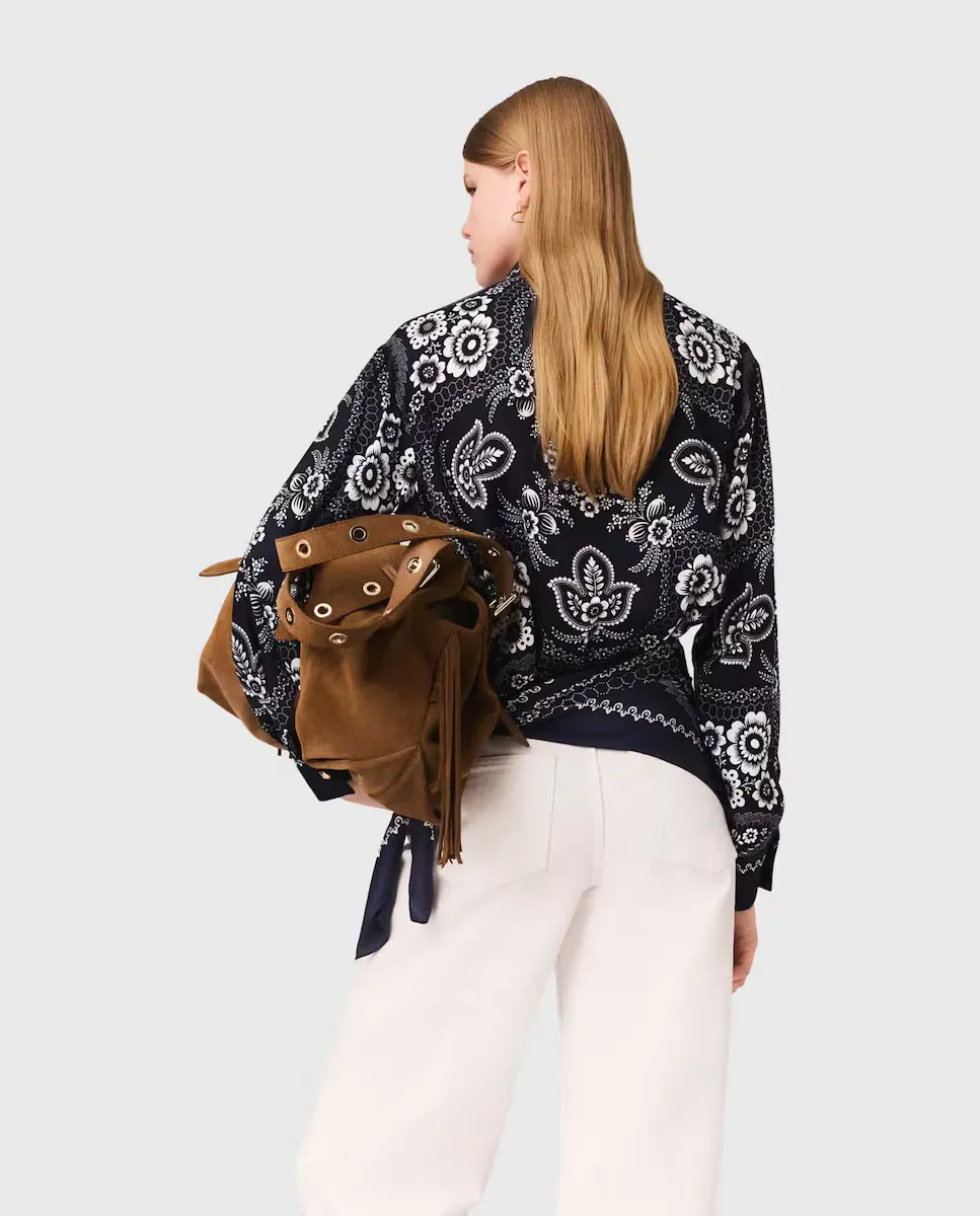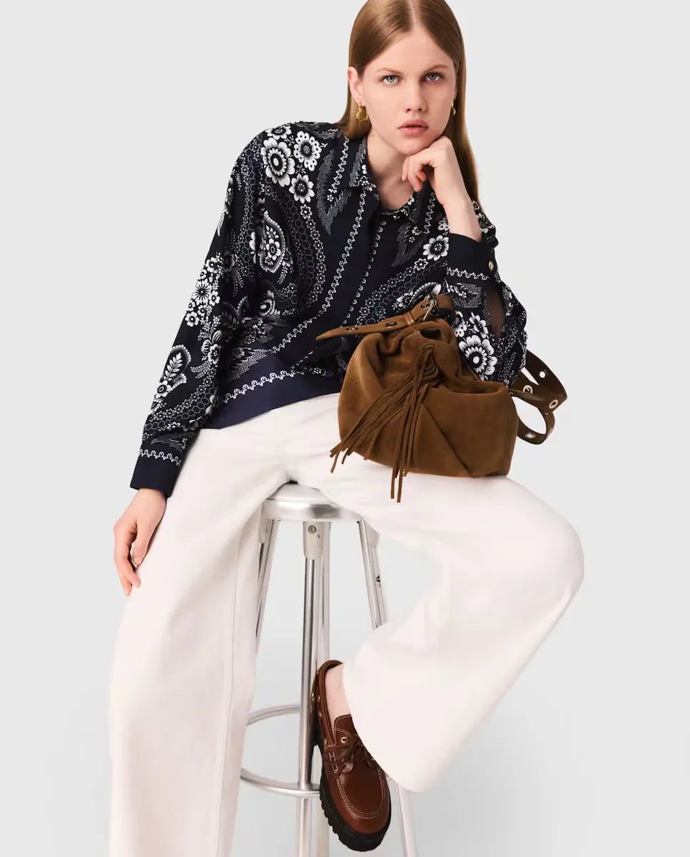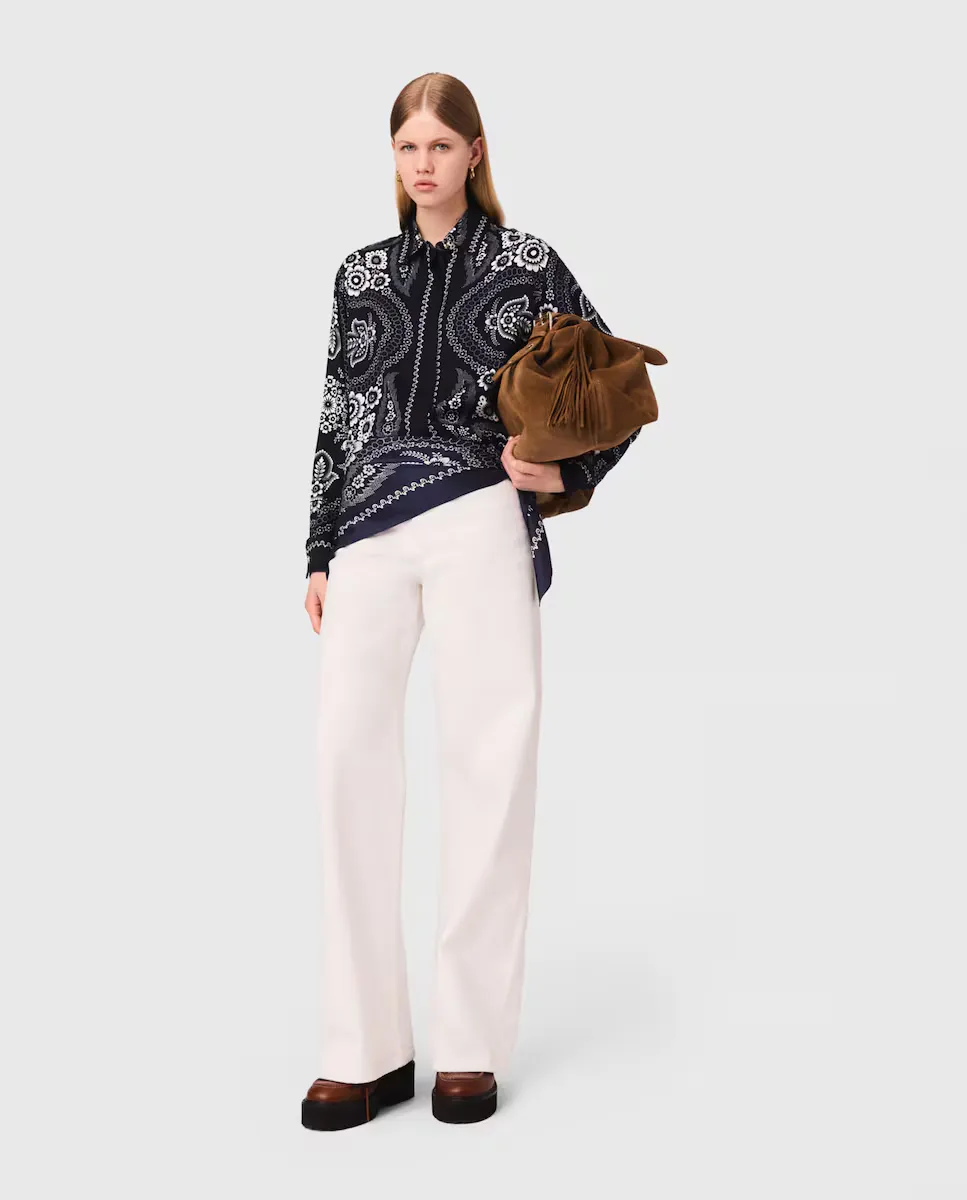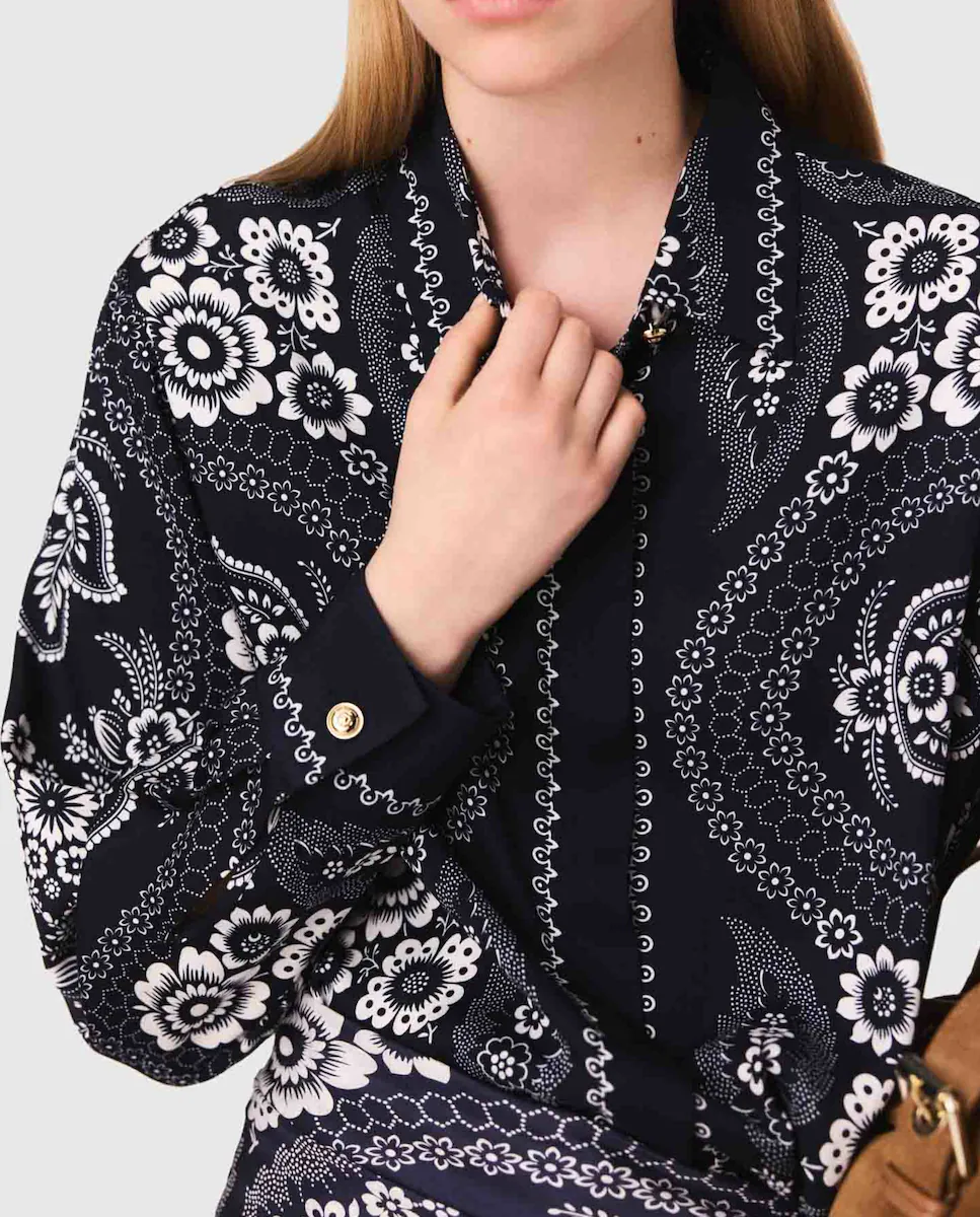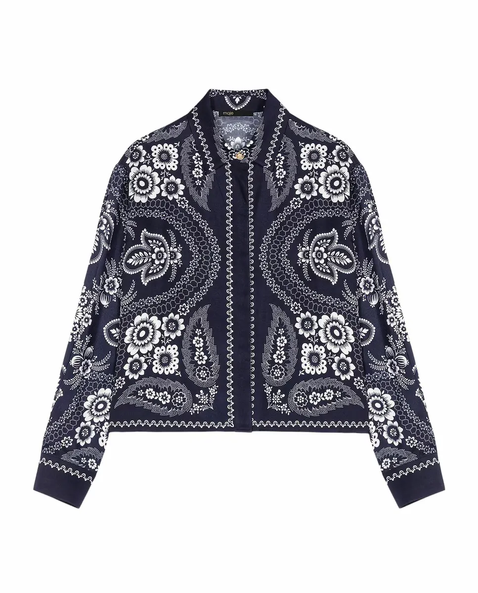 Короткая струящаяся и сатиновая рубашка с цветочным принтом. Воротник-камизет с декоративной кнопкой. Закрытие на пуговицы с застежкой в виде клапана. Более длинный крой сзади. Maje предлагает коллекцию, состоящую из современных и элегантных вещей, чтобы легко преодолевать сезоны. Эта струящаяся и сатиновая рубашка украшена цветочным принтом, вдохновленным мотивом пейсли, является как элегантным, так и вечным элементом коллекции. С воротником-камизет с декоративной кнопкой и длинными рукавами с застежками на пуговицах, она имеет более длинный крой сзади и закрытие на пуговицы с застежкой в виде клапана. Носить с белыми брюками для шикарного и свежего образа, объемными лоферами для современного акцента и замшевой сумкой с бахромой, чтобы завершить этот стиль преппи и непринужденности.
